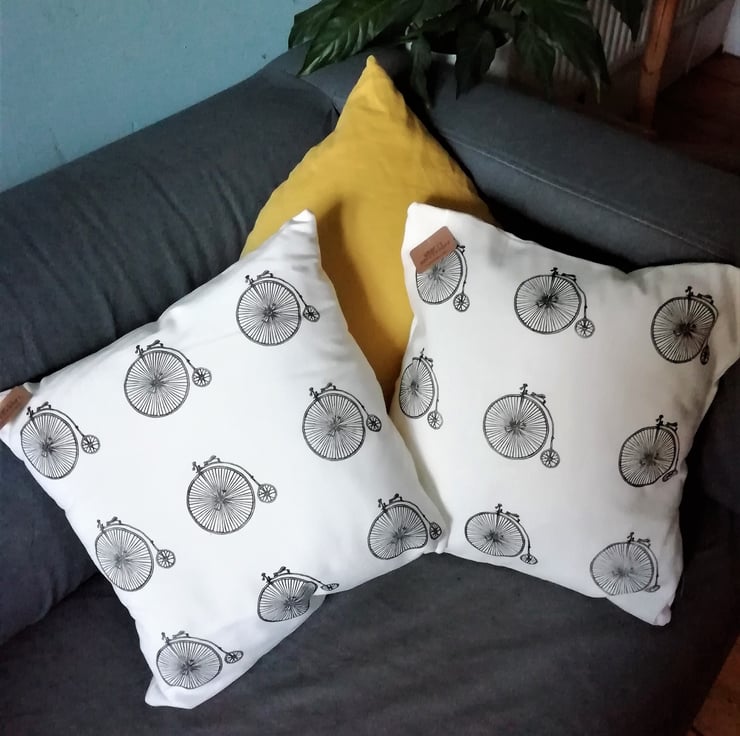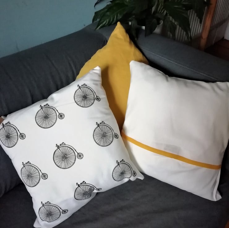 This cushion cover has been handprinted on cotton fabric using the block printing technique with one my Penny Fathing hand carved stamp. It has also been hand sewn with an envelope style back with yellow bias binding. I've even hand made and stamped the inner label washing instructions!