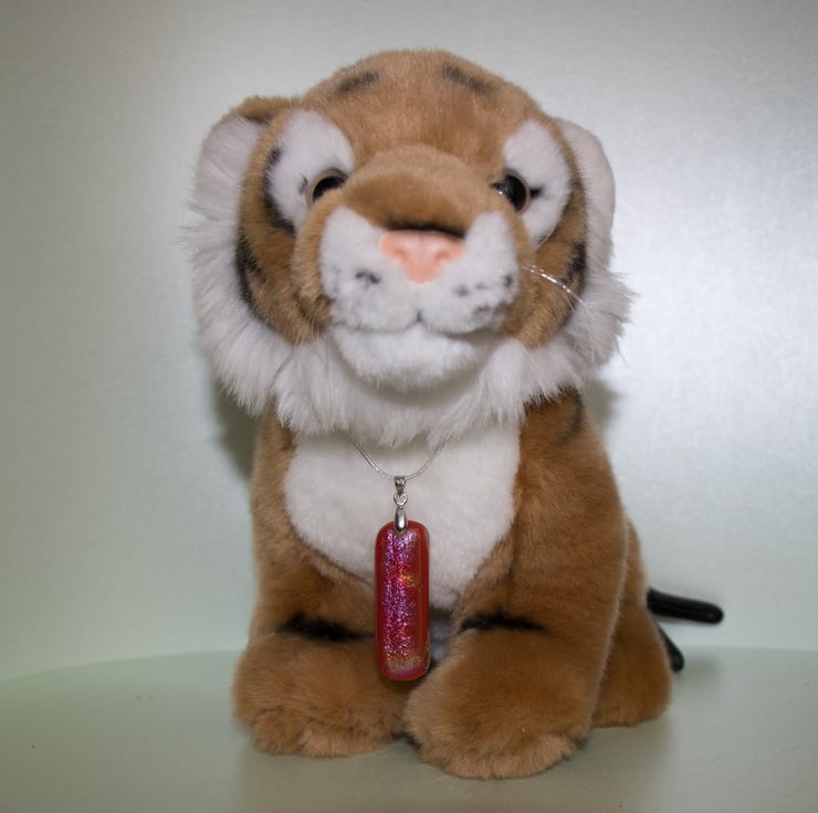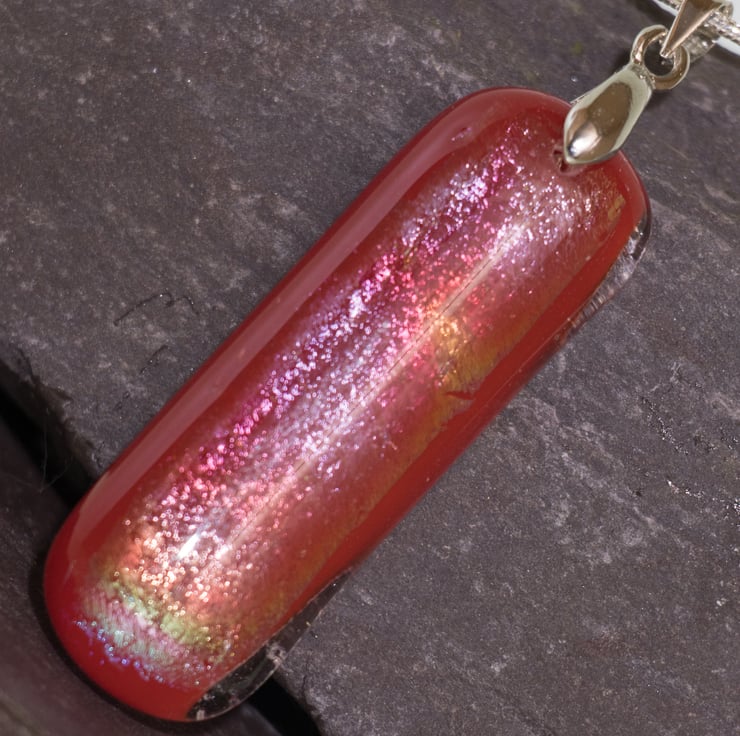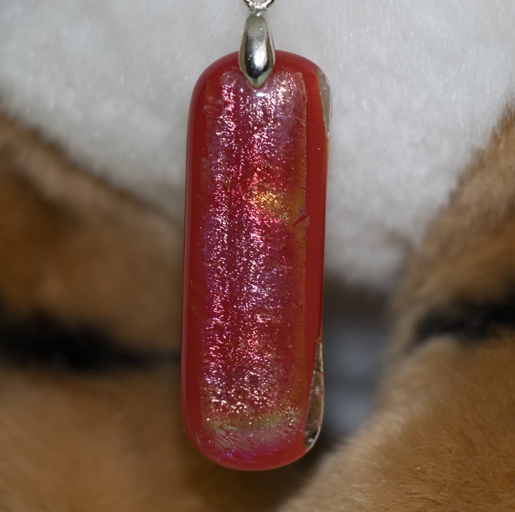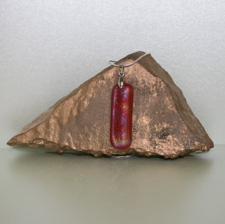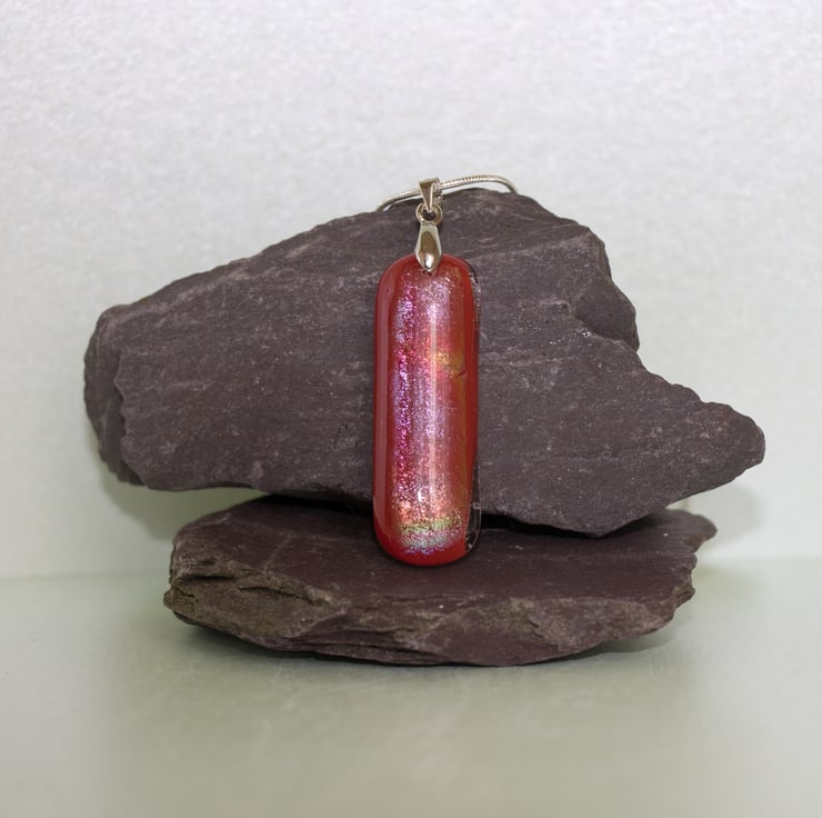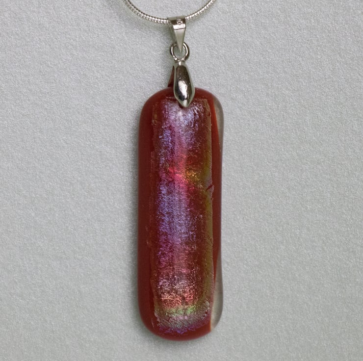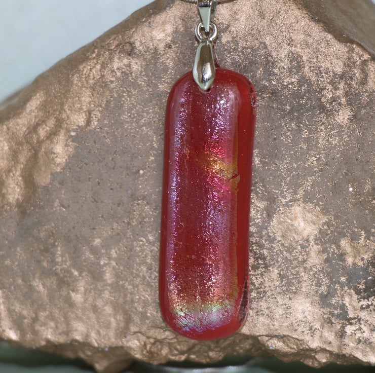 It's a red rectangle of Dichroic Glass that is approximately 4.2cm tall and 1.5 wide. It is strung by a silver-coloured swivel bail on a chain that is 20 inches long. You can choose from silver-plated or sterling silver chains at checkout.