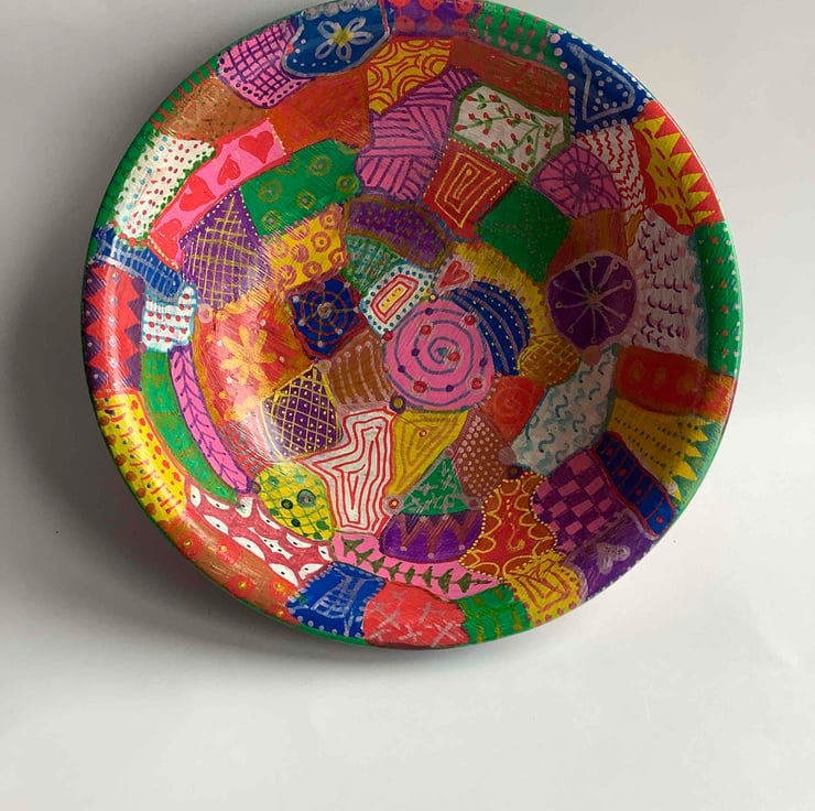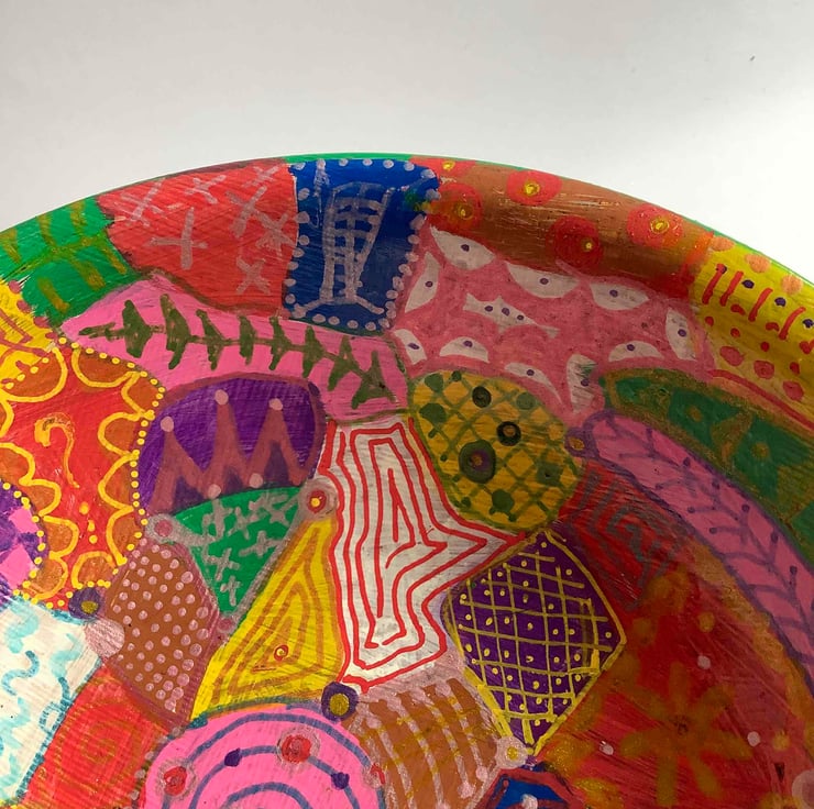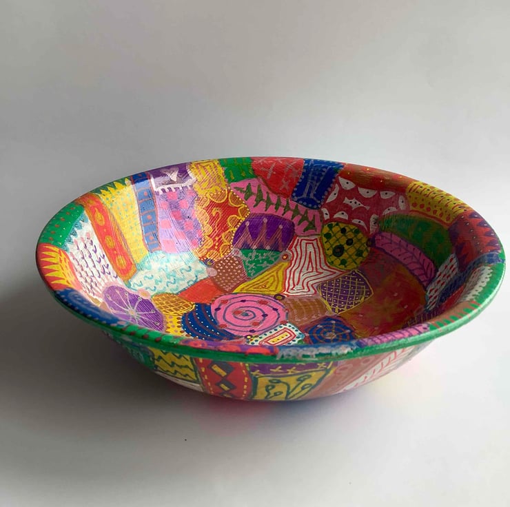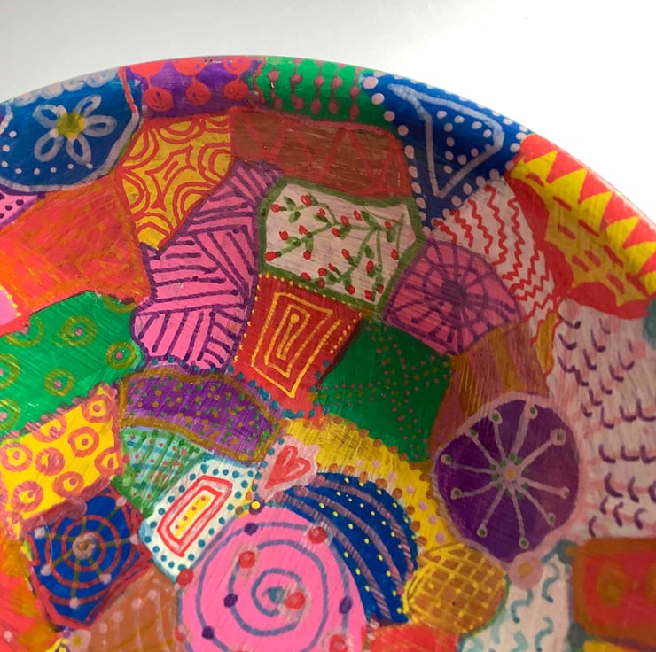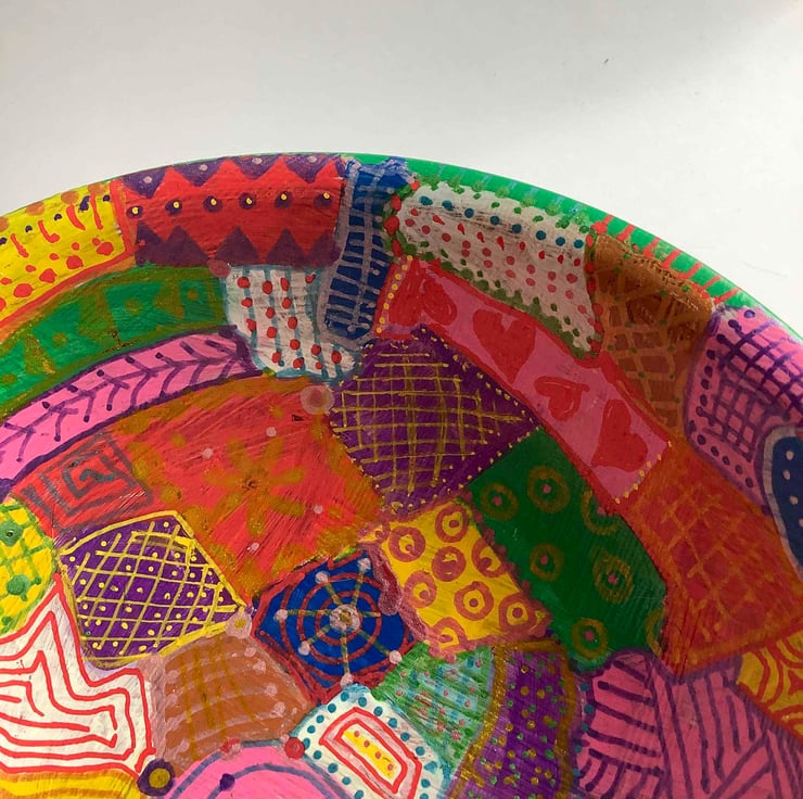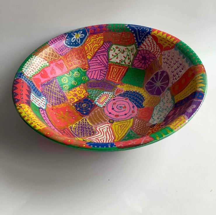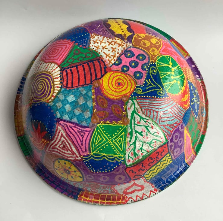 Another rescued bamboo bowl which has been cleaned up and hand painted with various patterns.
