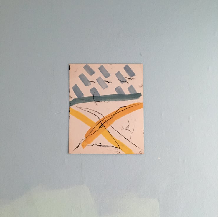 Each print is unique and made using a monoprinting technique, relief ink is rolled onto glass and the paper is placed lightly on the ink. Impressions on the back of the paper will press the ink onto the surface creating one off images or marks.