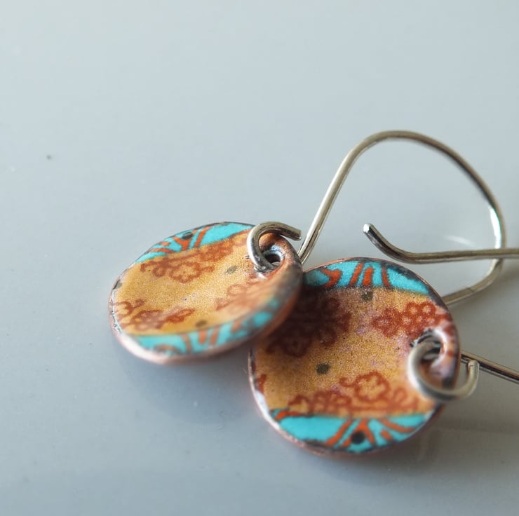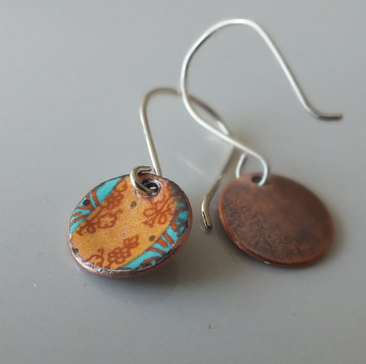 Enamelled earrings with a pattern inspired by patchwork fabric. Each disk is slightly concave, measures 13mm in diameter and has a natural copper finish on the back. The earring wires are handmade from sterling silver.