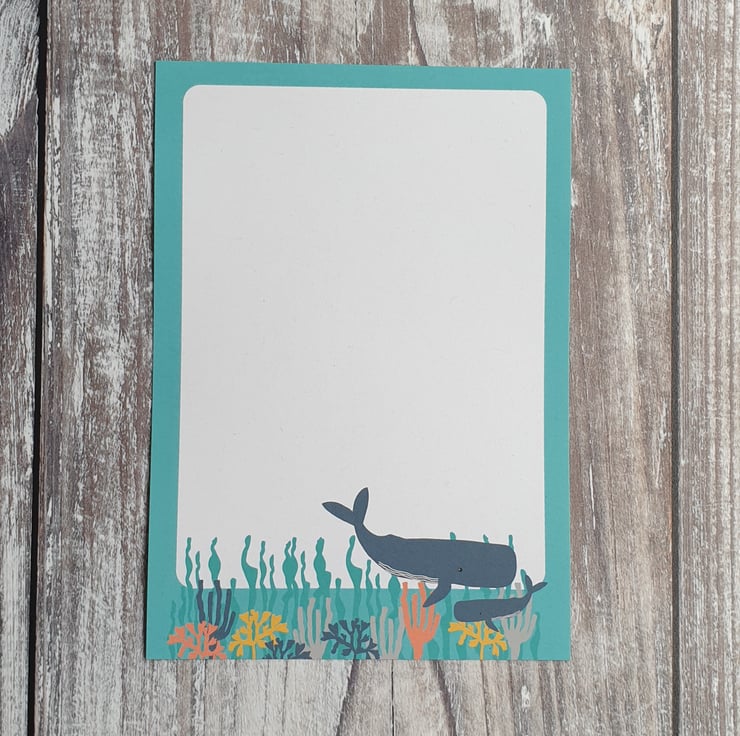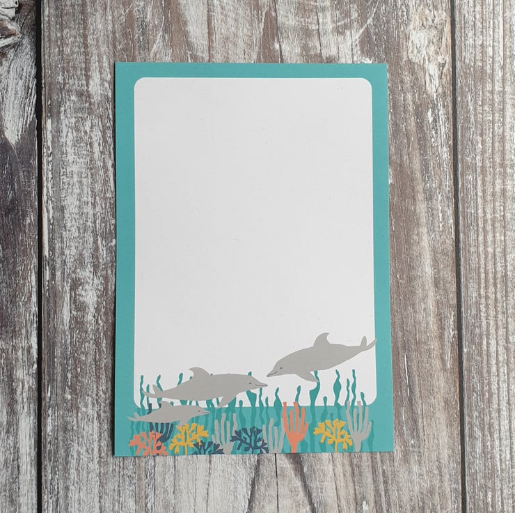 This set features 2 sheets with a dolphin design and 2 sheets with a whale design, both on a aqua blue and coral filled background.