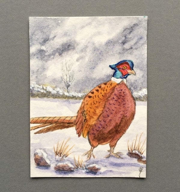 This is an art card edition and original, hand painted in watercolour, which measures 2.5” x 3.5”, and shows a pheasant in a winter landscape. It will be supplied with a small envelope and sent in a larger protective envelope. Free postage to destinations in UK.