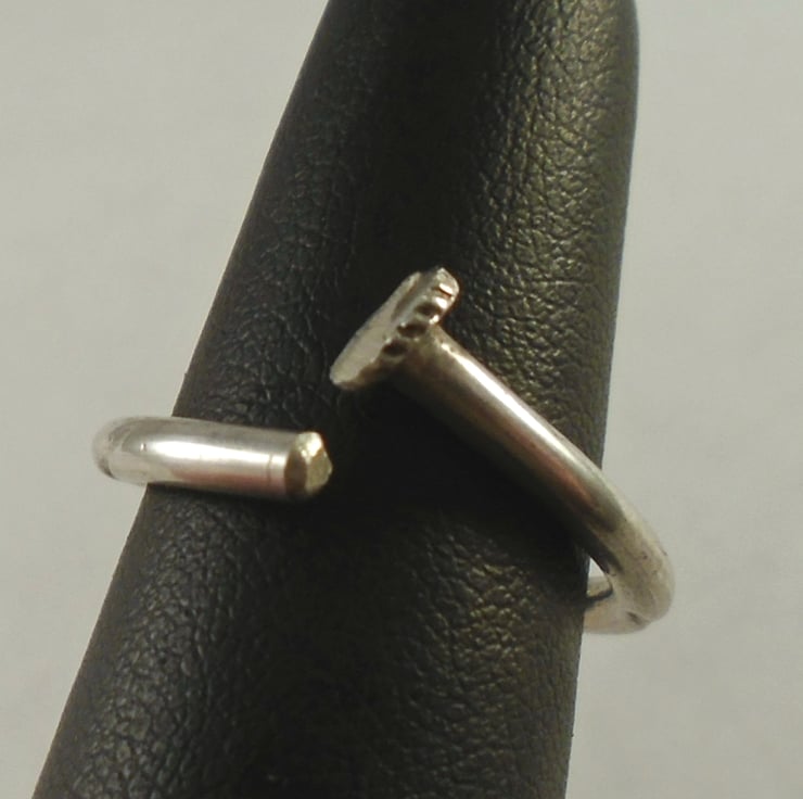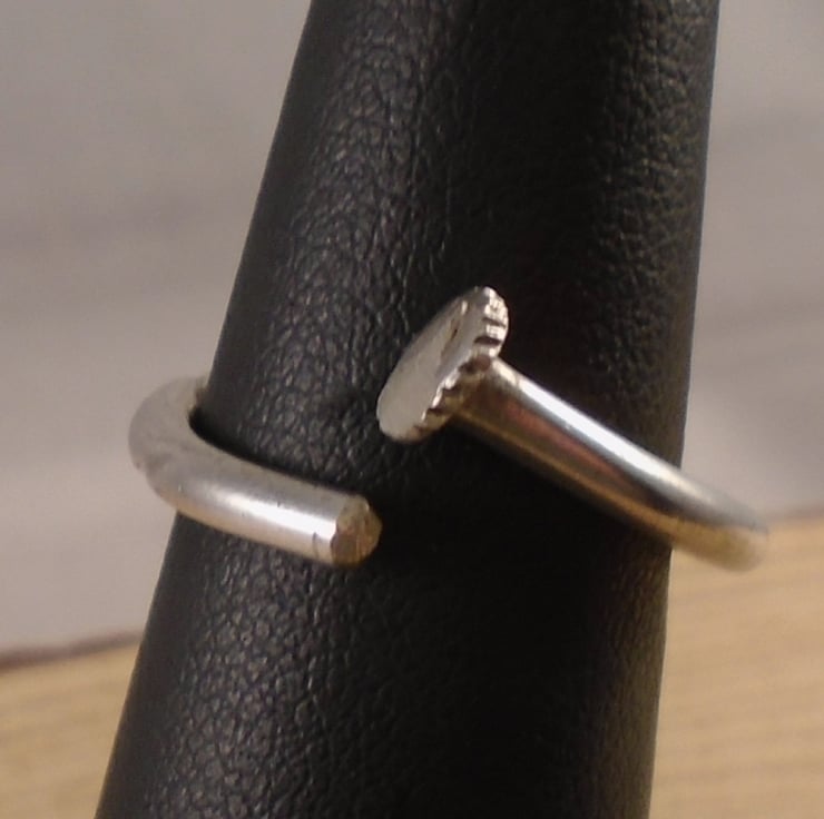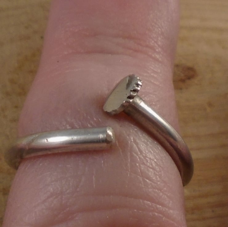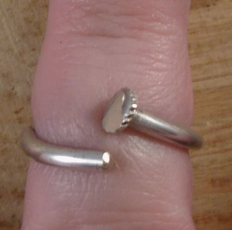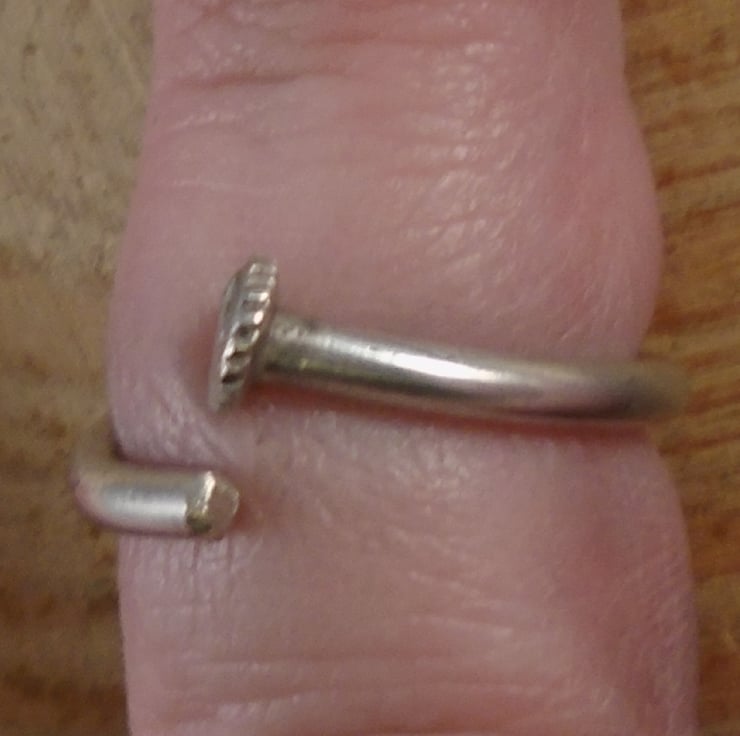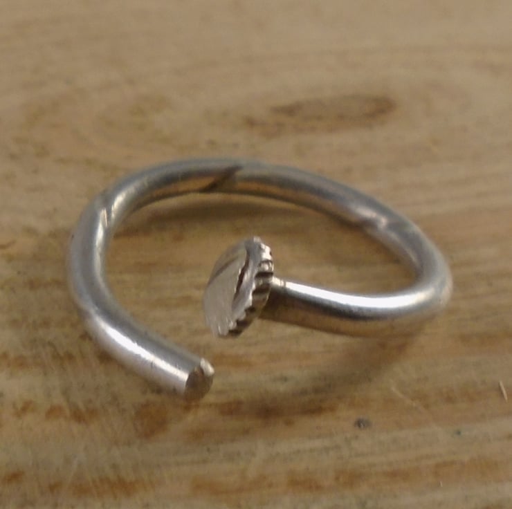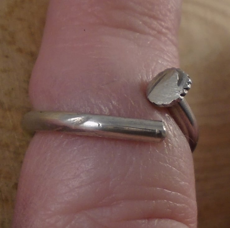 A simple, yet unusual ring, hand made from the handle of an old silver plated teaspoon. The bowl of the spoon has been sawn off, and the remaining handle has been bent around a mandrel to form the ring.