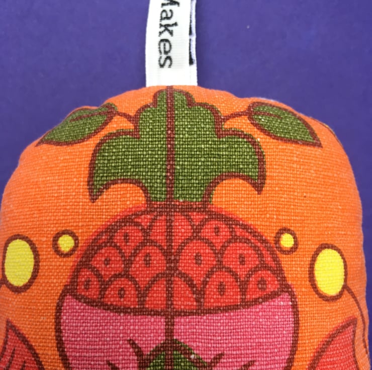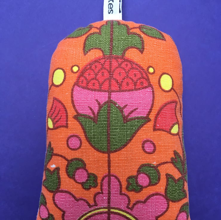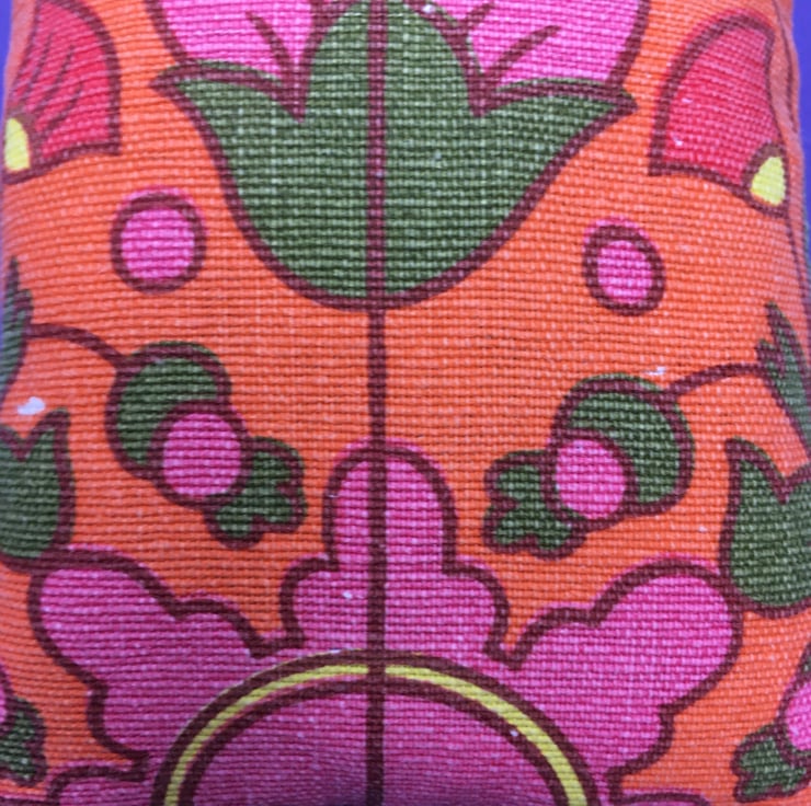 To make this lavender bag I have used a screen print of Eric, one of my little 1960’s wooden Viking men and original vintage 1970’s orange and pink scandi style fabric. This was once a very loved tablecloth, that was a tad too tired to be used anymore.