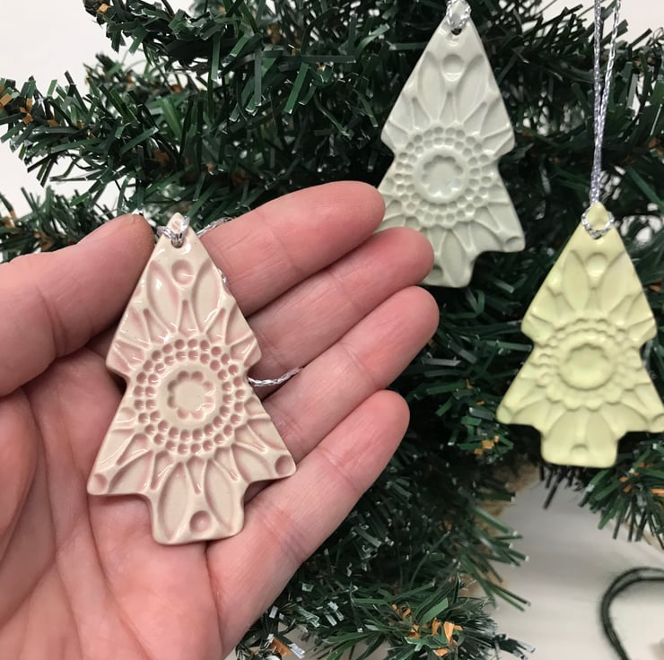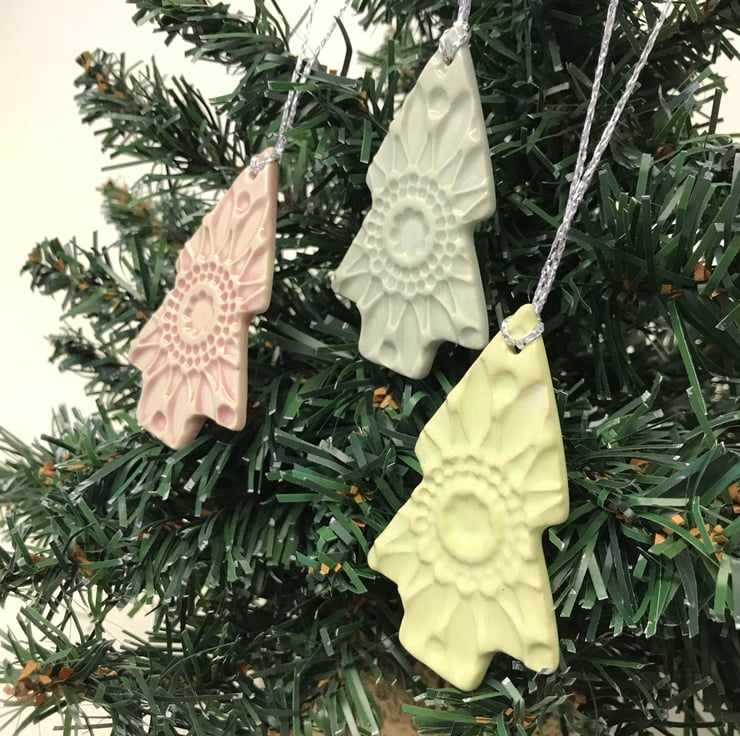 These lightweight ceramic tree decorations have an imprinted design and are finished in gorgeous pastel glazes. (Pale pink pale blue and a very pale green)They are made from white earthenware clay and fired once, then glazed and fired again. They measure 6.5cm length and 5cm width and 3mm deep and hang from a silver ribbon, Glazed on the front only. They would look perfect in a modern interior. Very thin and lightweight.