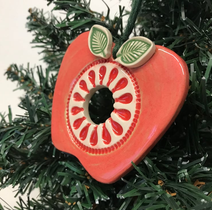 This cute little rosy apple is hand cut from white earthenware clay and decorated with pattern. It has been fired once, a rich glossy glaze is applied and it is then fired again - so is nice and strong. It measures 7.5cm x 7cm and hangs from a green string. It is glazed on the front and left plain on the back.
