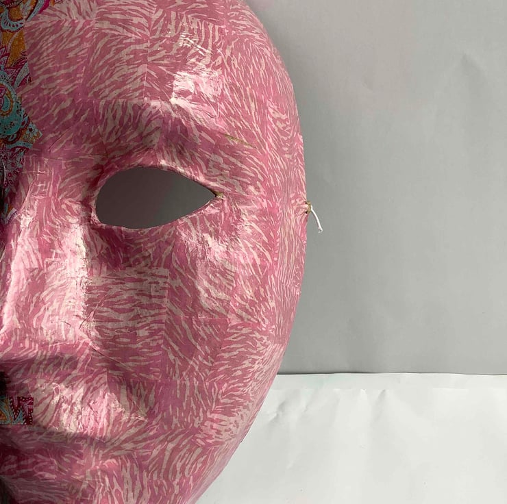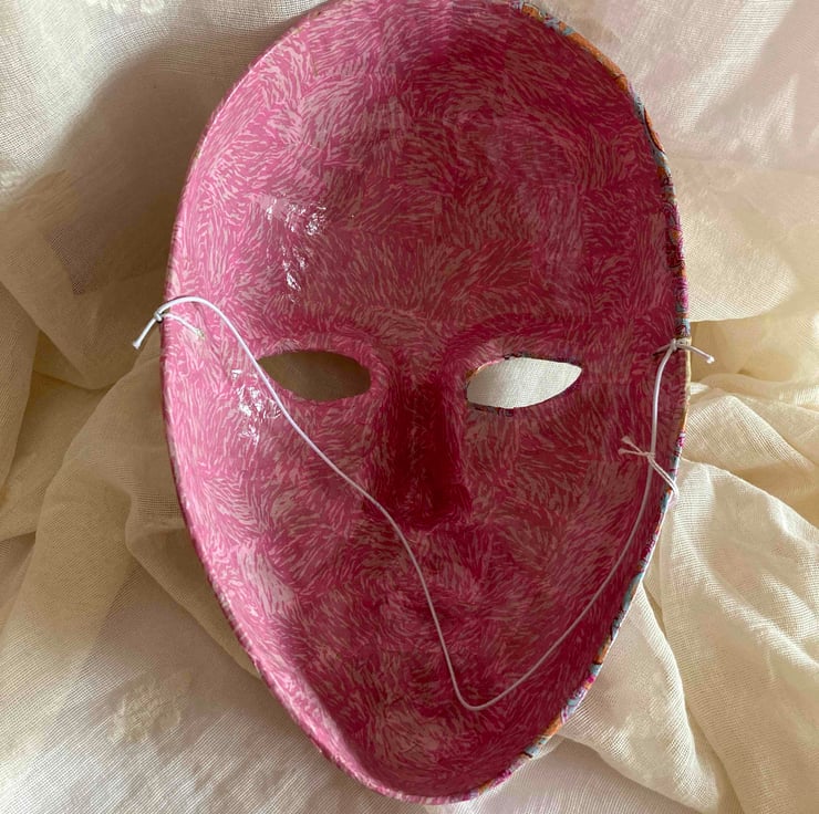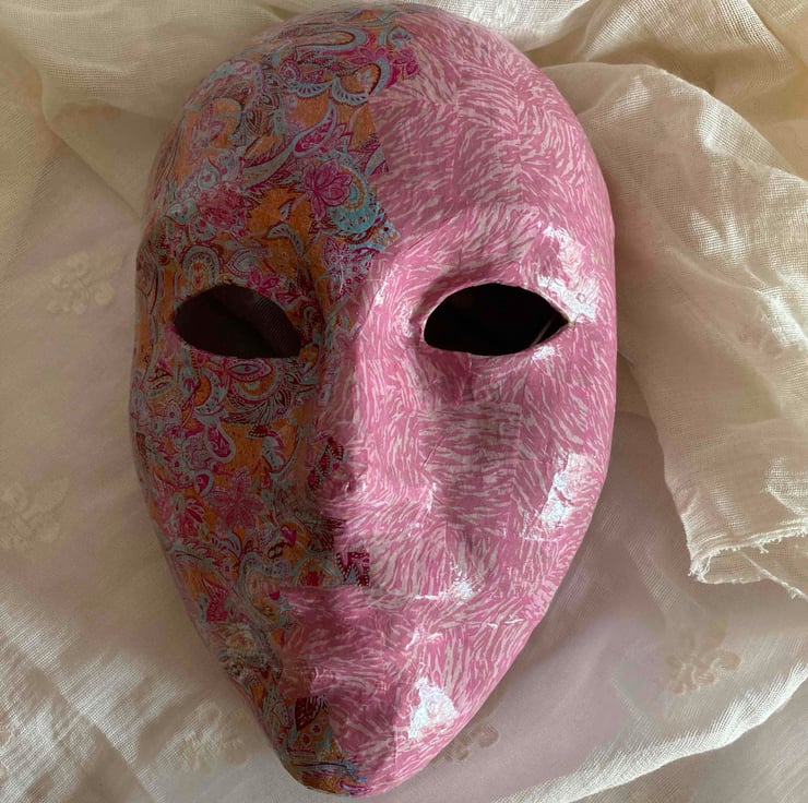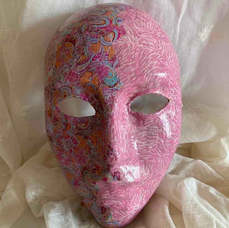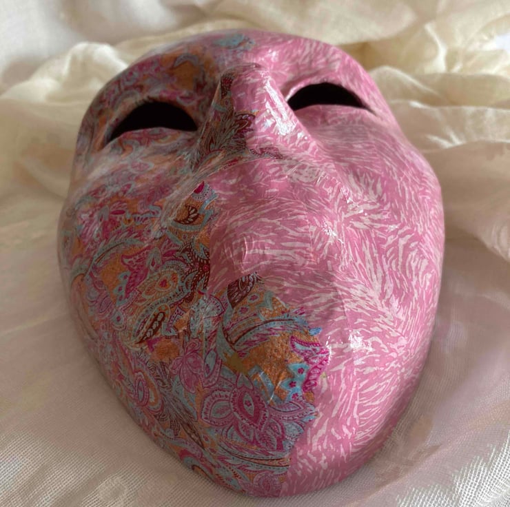 This paper mache mask has been Decopatched in very pretty papers and then varnished.