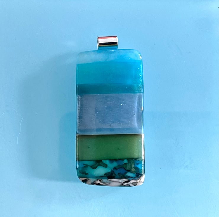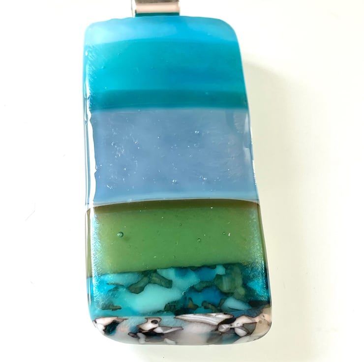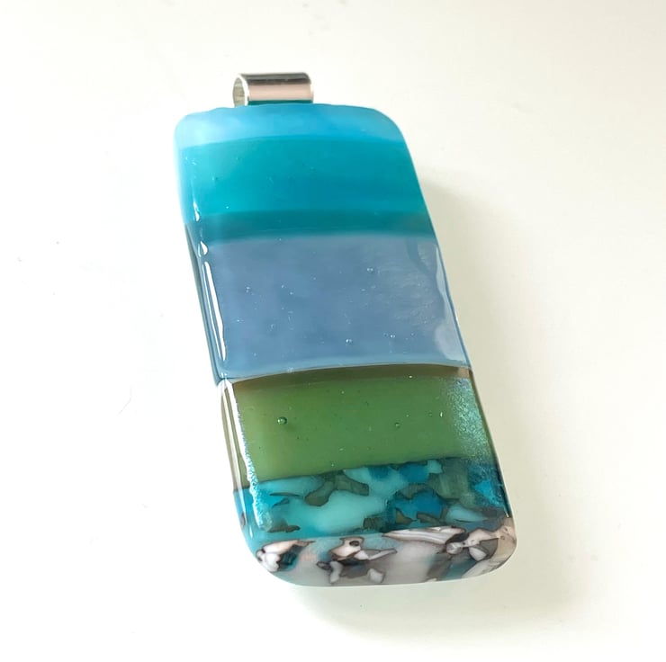 Stunning seascape glass pendant with a sterling silver bail, created used coloured and iridescent glass pieces, layered to create the depth and colours of the sea. These are a labour of love and are created through a three stage process, with 18hr firing for each stage. This is a real statement piece of jewellery that will be admired when you wear it. Size approximately 6 x 2cm