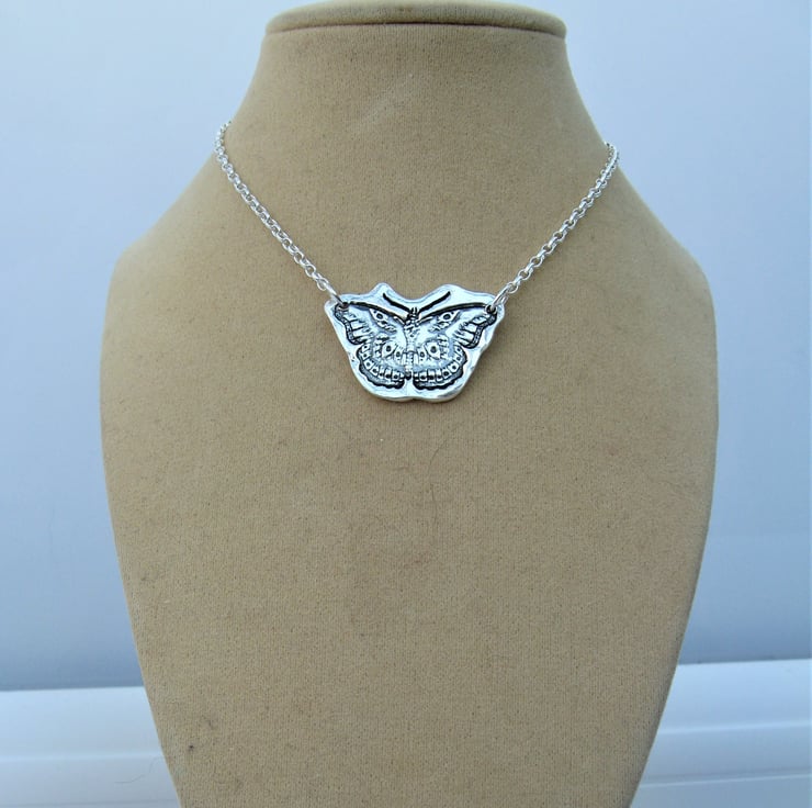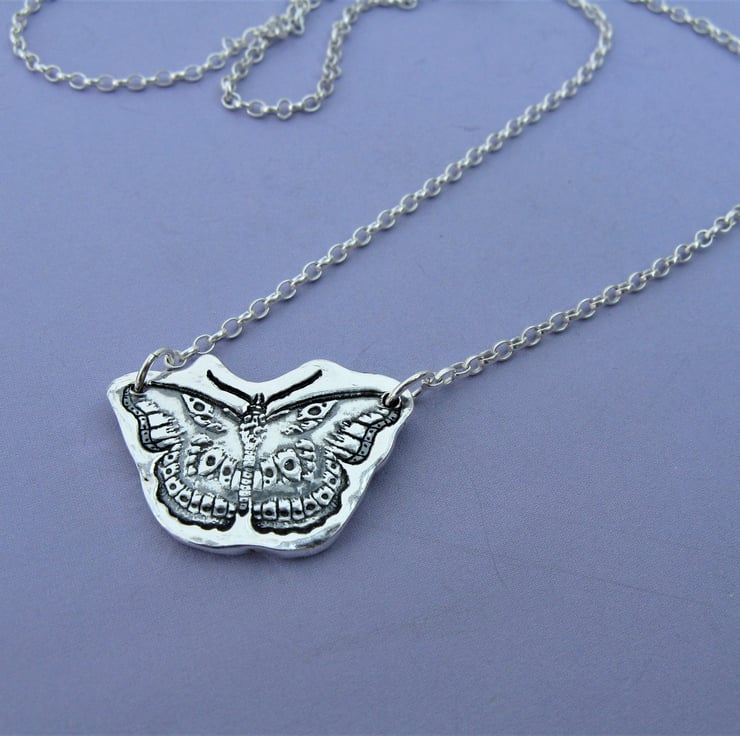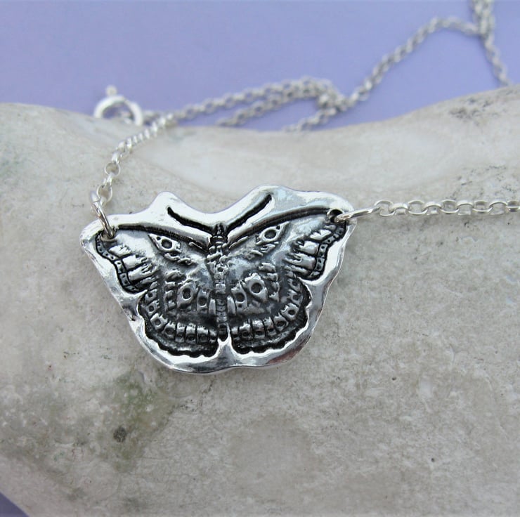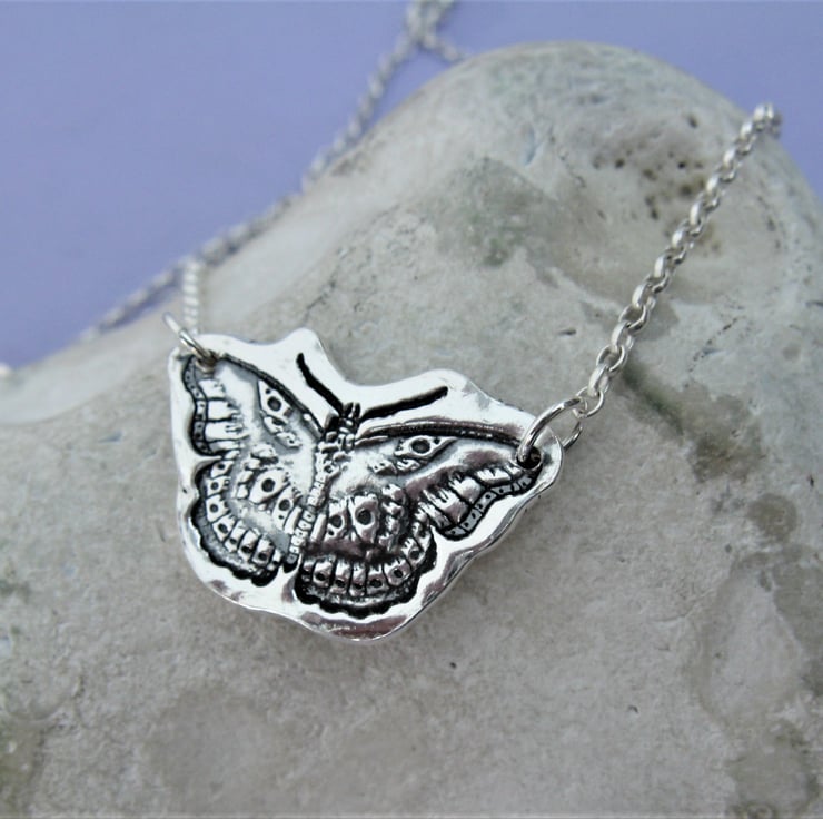 This pretty necklace was made by creating a butterfly shape from recycled fine silver. I then made the butterfly detail imprint and it with a patina effect.