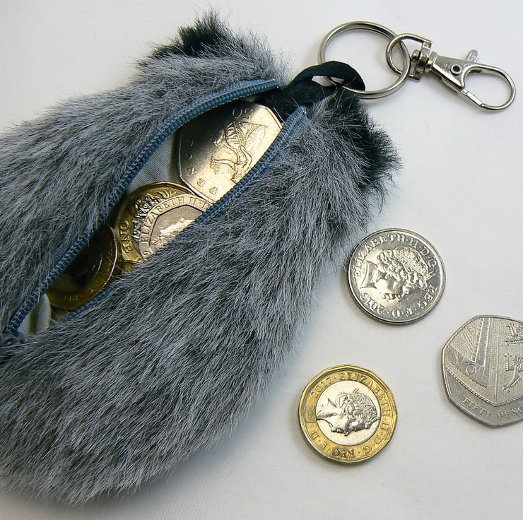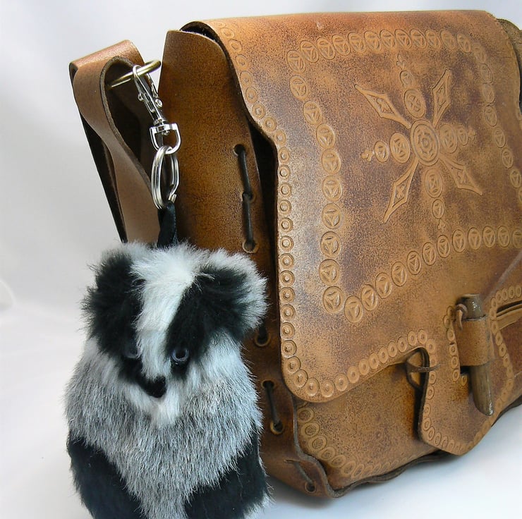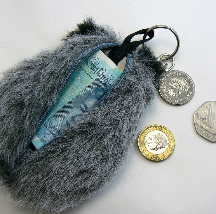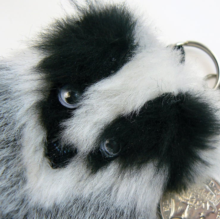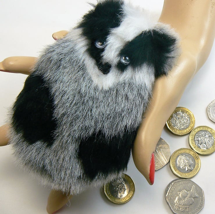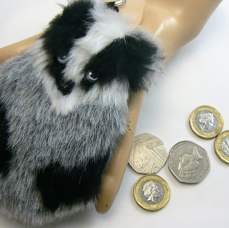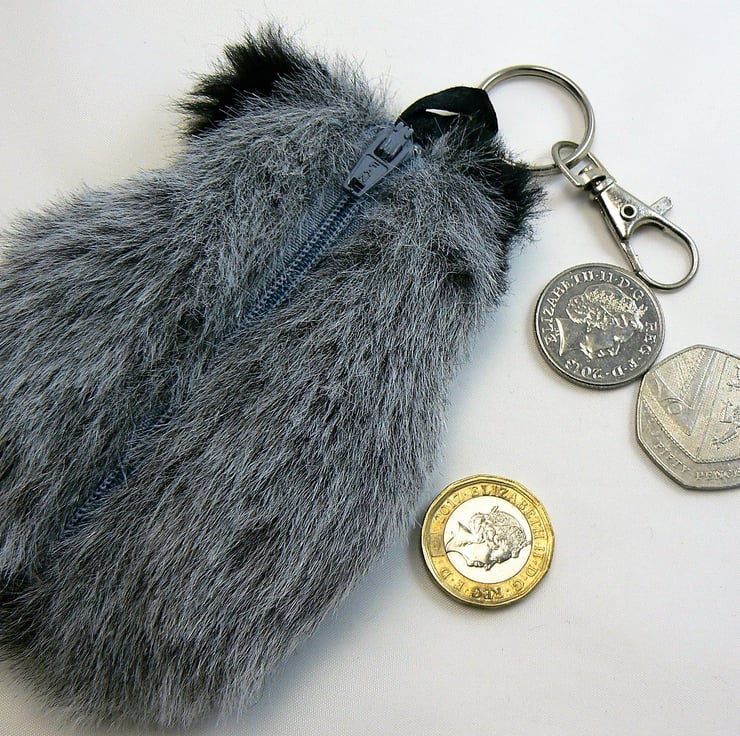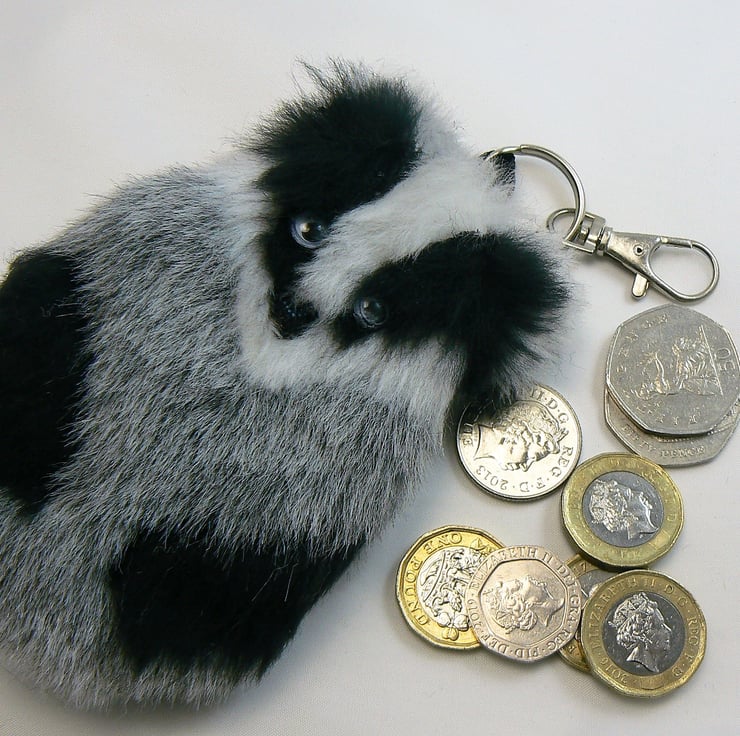 This little badger coin purse is made from faux fur, it is lined with cotton and has a zip closure with a keyring and lobster clasp to clip onto handbag if wished. He has googly eyes and a little black shiny nose.