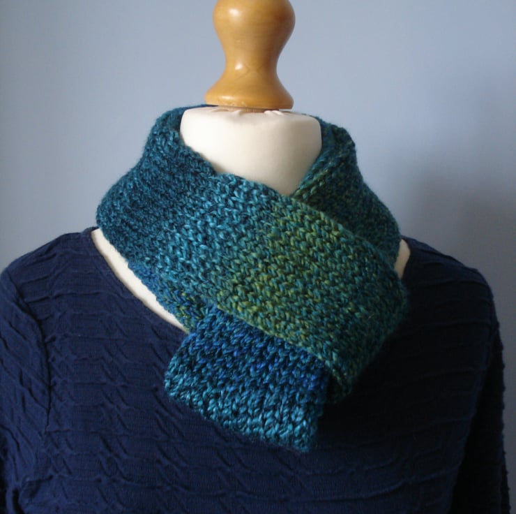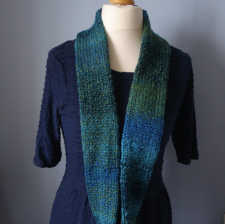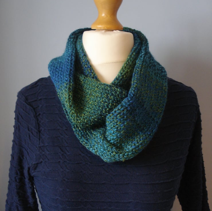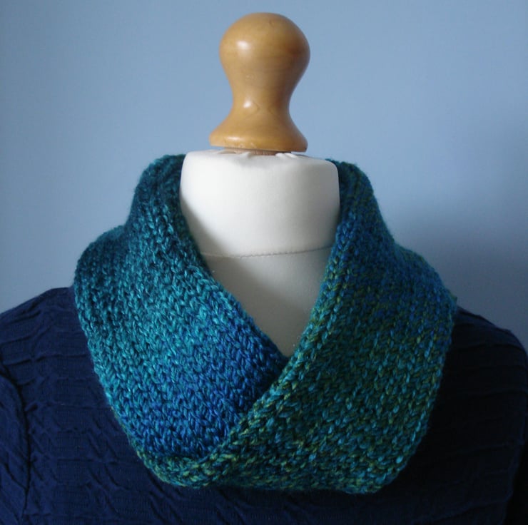 This infinity scarf has been knitted from beautifully soft acrylic yarn in wonderful shades of blue, green and turquoise, which blend in a marbled effect. It is double thickness and long enough to wear in a variety of ways, so will keep you really warm.