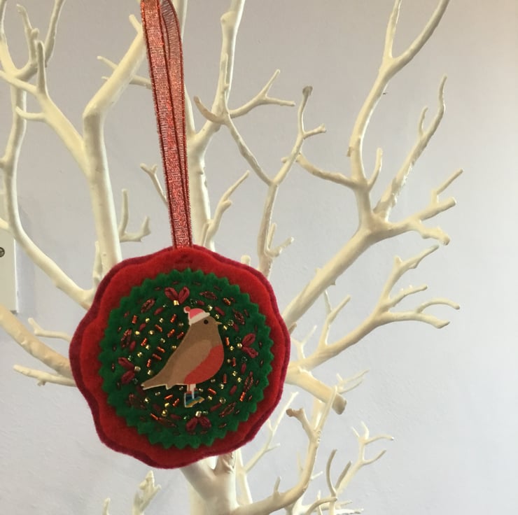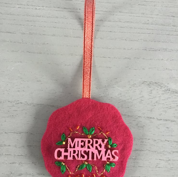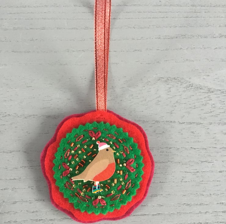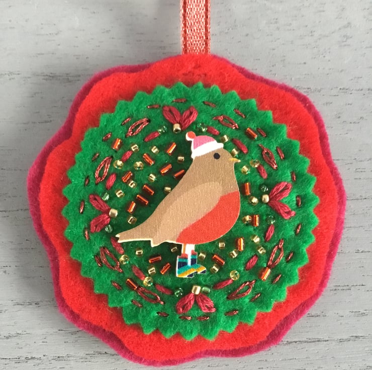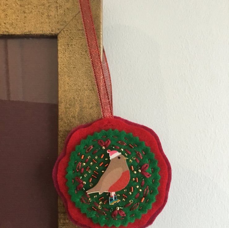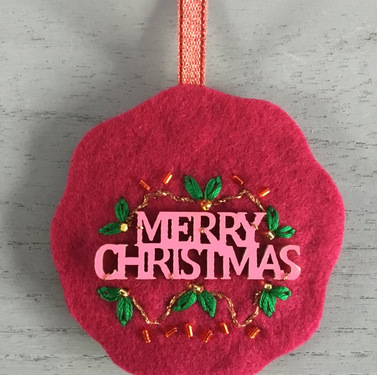 This double sided textile decoration is made of red and green felt with a hand embroidered design on each side. A wooden Christmas Robin wearing a Santa hat is surrounded by hand embroidered running and lazy daisy stitches in red threads, dotted with red and gold beads. On the other side, is a ‘Merry Christmas’ message made of wood, embroidered in green and bronze threads with gold and red beads.