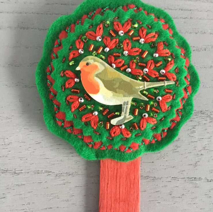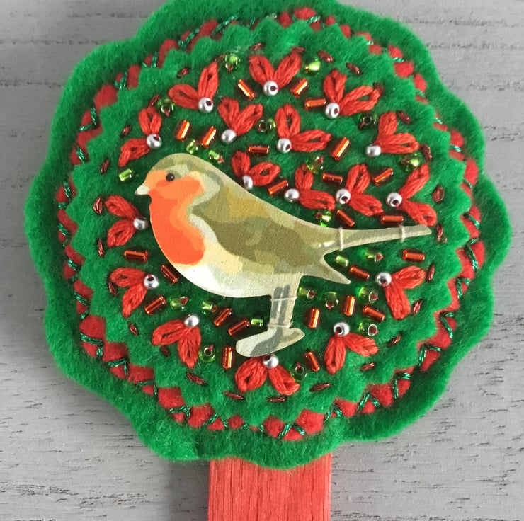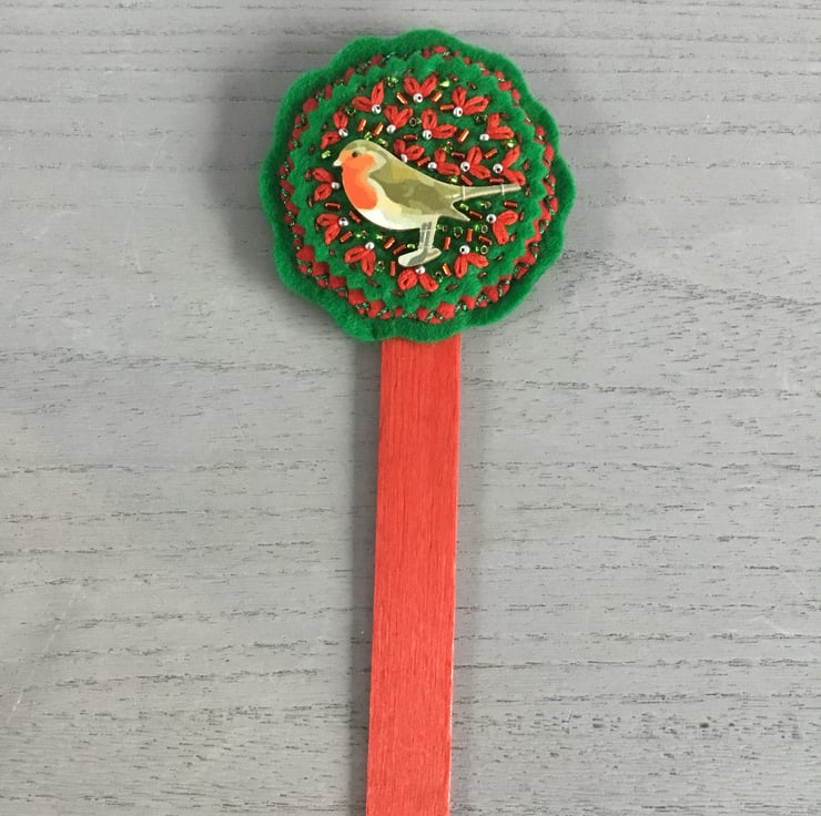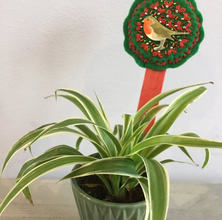 This Garden Robin Houseplant Decoration is made of red and green circles of felt on a red wooden planting stick. At the top of this stick is a circular hand embroidery with a stitched wooden Robin motif surrounded by Lazy-Daisy Stitches that look like red leaves, dotted with silver, red and green seed beads.