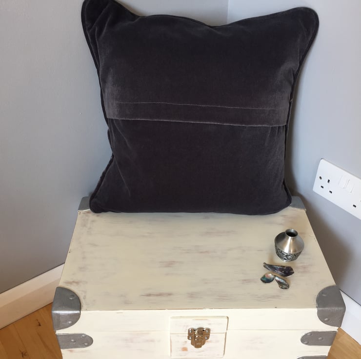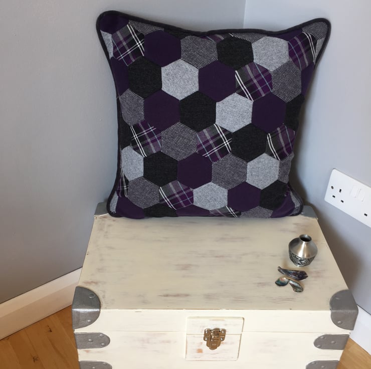 An 18” (46cm) square cushion made from large hexagon shaped patches hand stitched together in shades of predominantly grey and purple. The cushion is piped and backed using a toning mid-grey velvet. The backing has an envelope style opening.