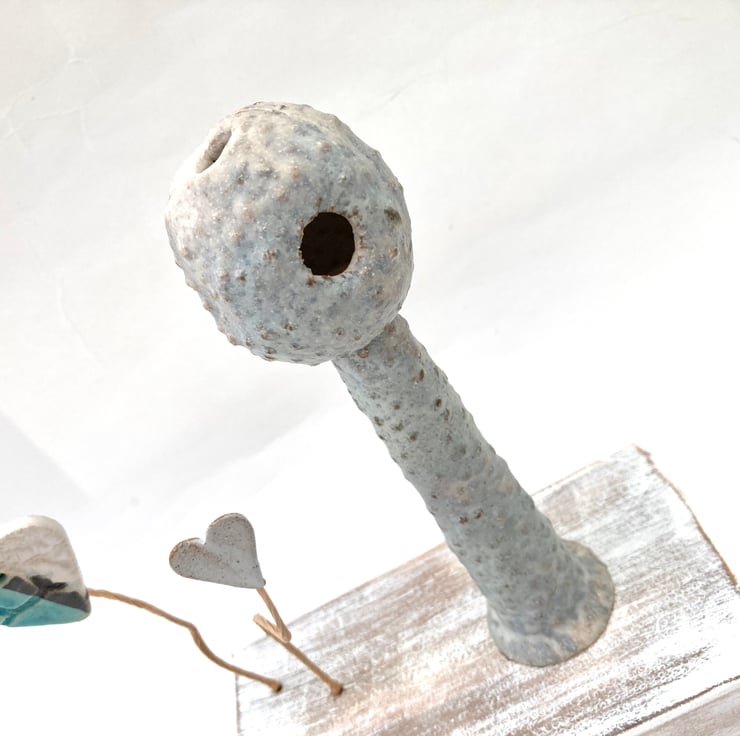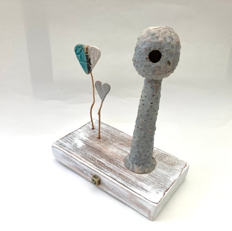 This piece was sculpted using only my hands and a few clay tools. It has a light texture applied before been painted with oxide before the first firing. It is then glazed and fired again. It is mounted onto a white washed piece of quality wood. I have attached two sweet little hearts to make this a totally unique piece.