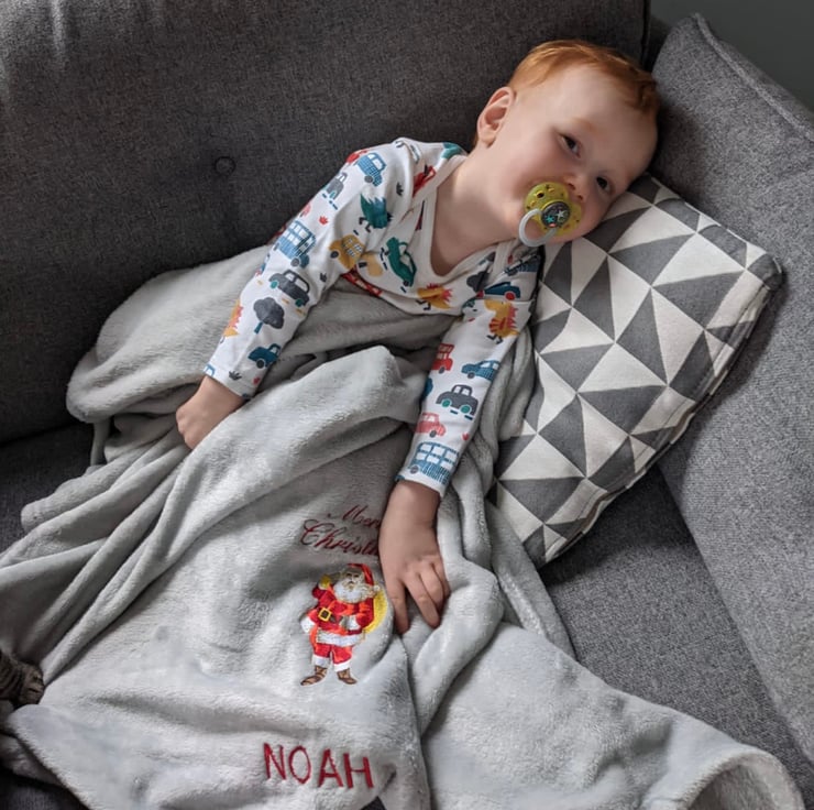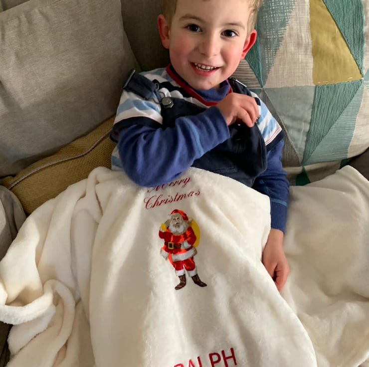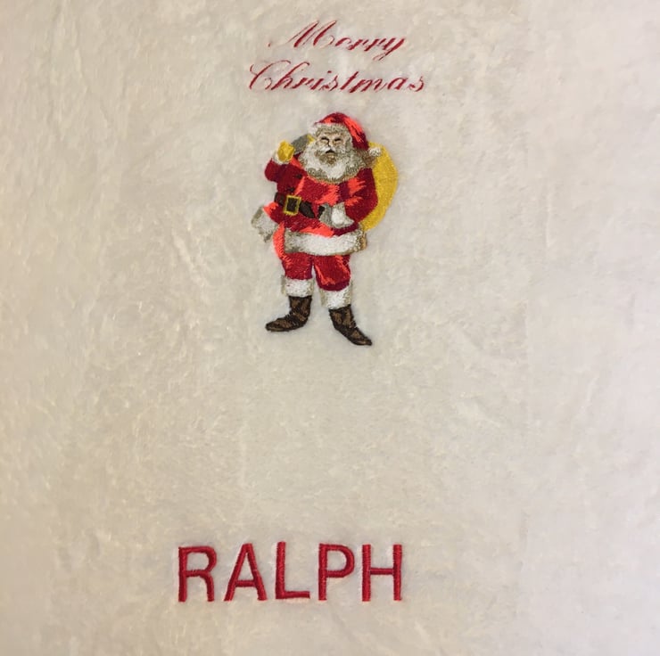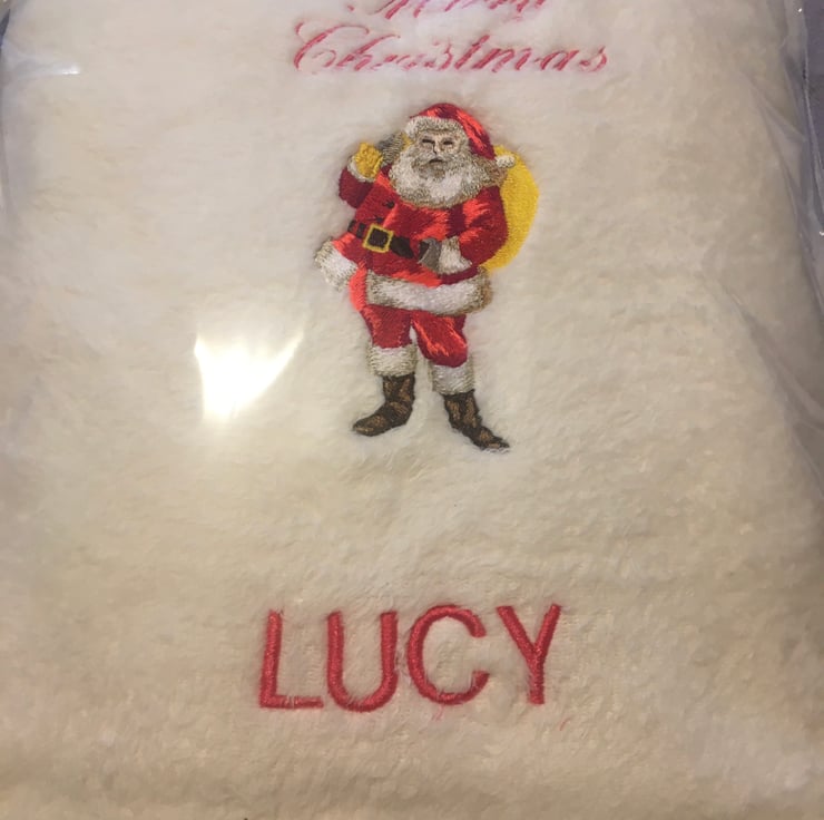 Embroidered with Merry Christmas and a gorgeous Santa, and name of recipient.