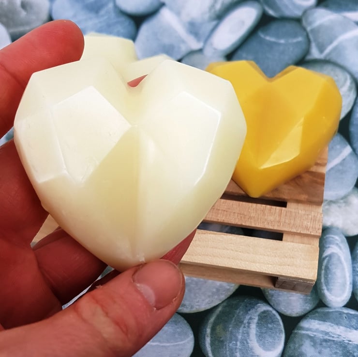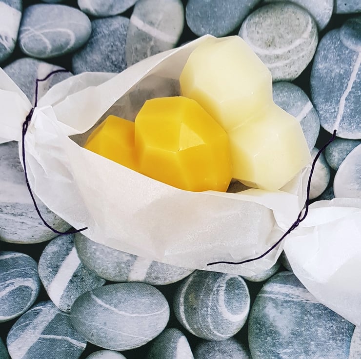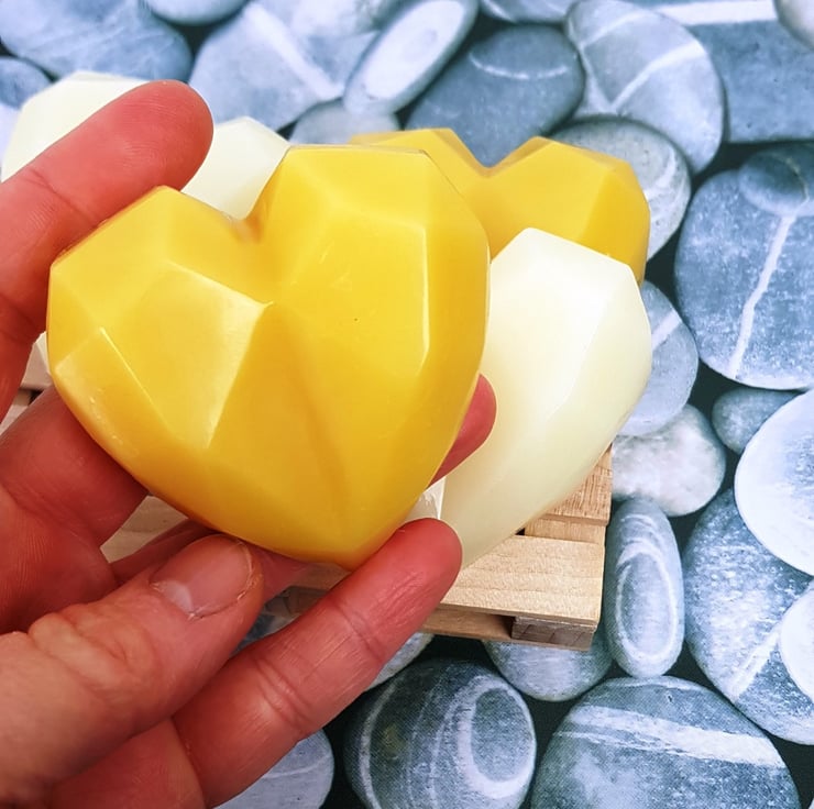 This is 100% pure beeswax in the shape of diamond hearts. Please note that due to the handmade nature of this product and the fact that I pour them by hand, the colour and weight vary very slightly. (In one of the images you can see some of the variety, the main images show the beeswax that I sell currently as white and yellow.