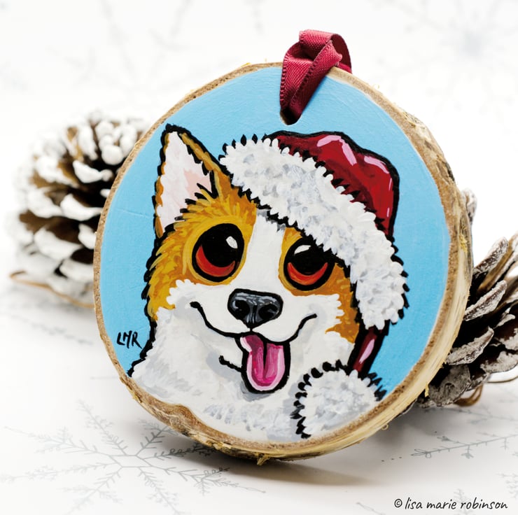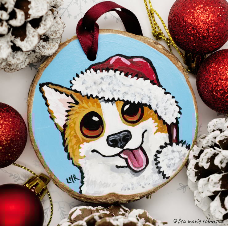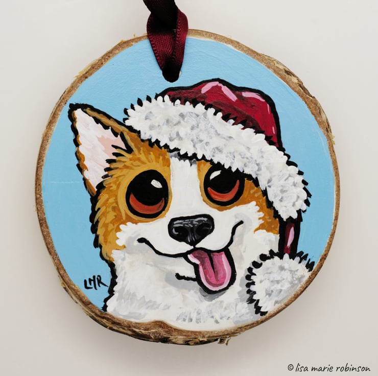 Super cute, and super derpy, festive hanging ornament featuring a painting of a corgi with a Santa hat sat on his head and his tongue hanging out. Blue background.