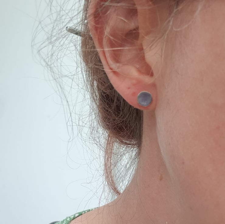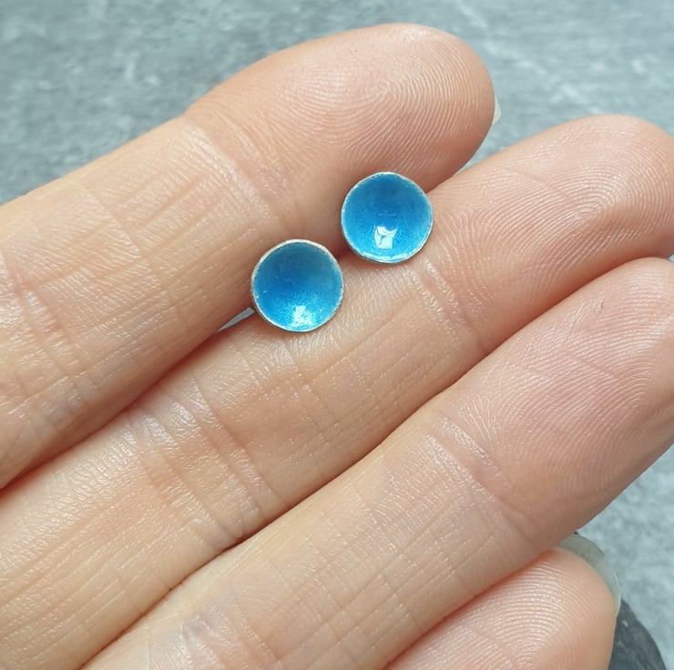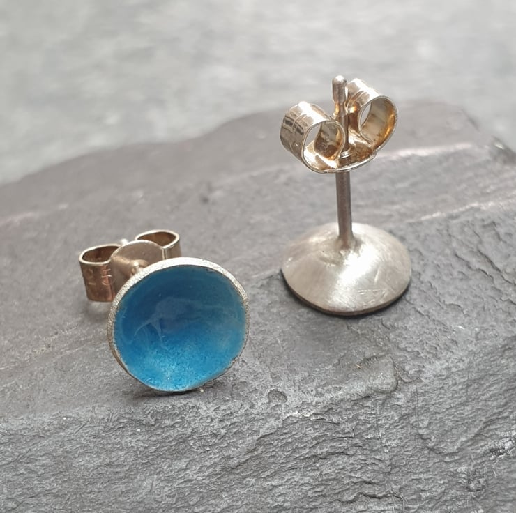 These bright blue earrings are made from small discs of sterling silver, domed into little cups and filled with kingfisher blue enamel, which is fired to a glossy finish. The backs of the earrings are polished to a satin shine. The ear posts and butterfly backs are also sterling silver.