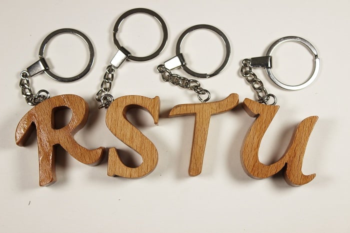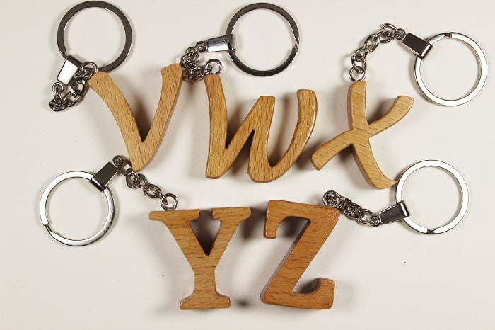 Wooden key rings cut in to the letters of the alphabet making a fun gift for all the family. The fobs are made from beech wood with a steel ring and chain. Beech being an ideal wood as it is both strong and splinter free. The fobs have been sanded to remove sharp edges and have been coated in a durable satin finish.
