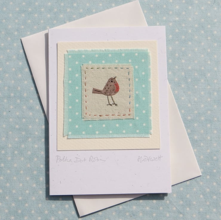 A unique hand-stitched miniature applique with embroidered details. The little robin is cut from my own hand-dyed recycled cotton fabric, and the central panel is stitched to a pretty polka dot fabric. Perfect little card for any time - a card to keep!
