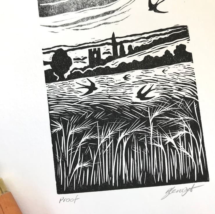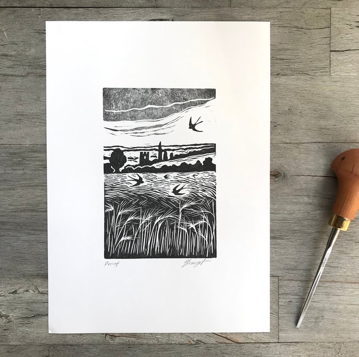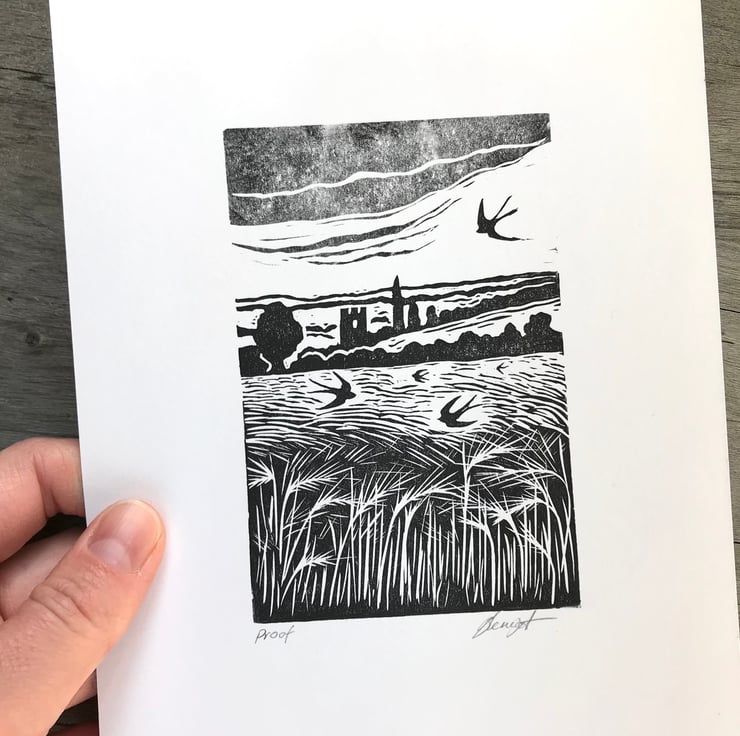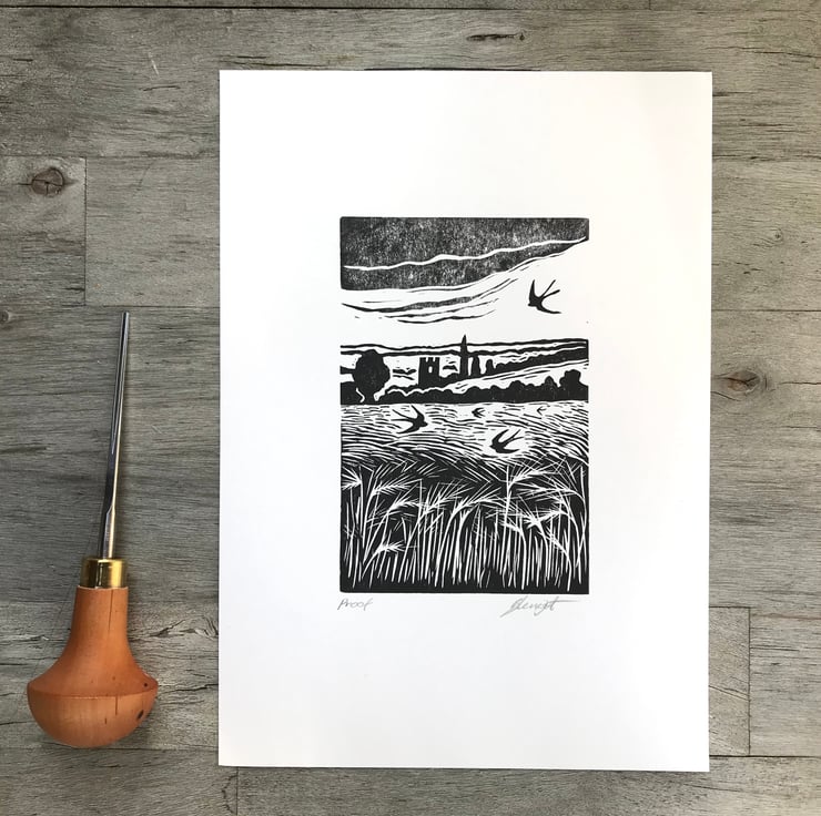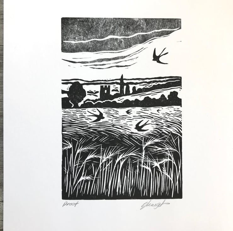 This listing is for 'artists proofs' of "After the rain" lino cut by Suffolk printmaking artist Beth Knight.