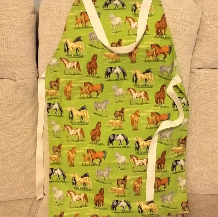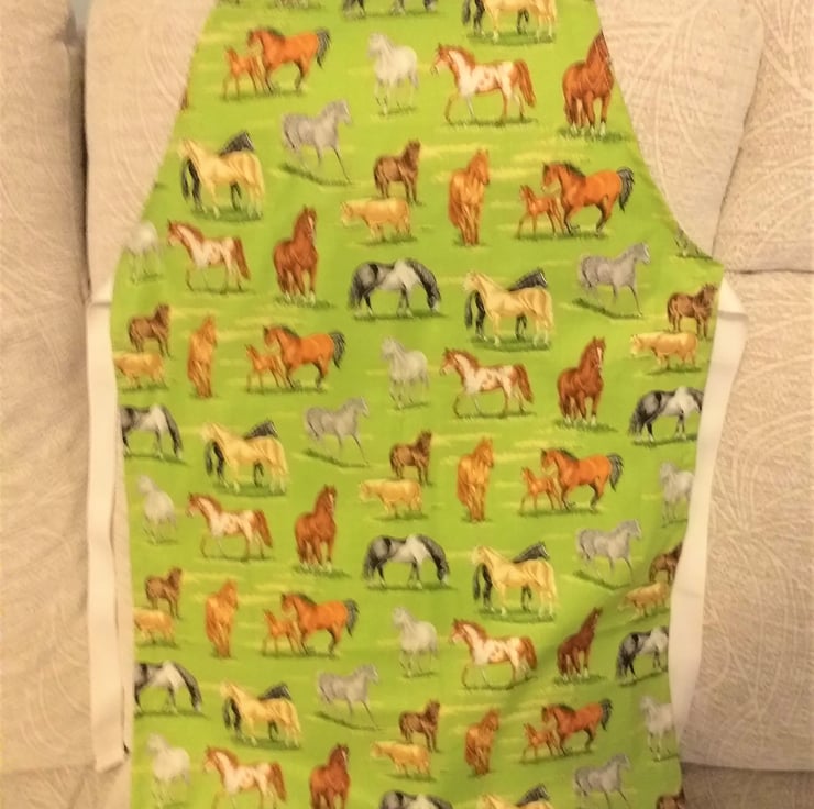 This is a lovely grass green cotton apron which will fit an older child, from about 8 to a small adult. It is scattered with a variety of horses and ponies. I have made it of a good quality machine washable cotton, with acrylic webbing straps. It measures approximately 27" (70cm.) from neck to hem, and 17.5" (45cm.) at the widest point,