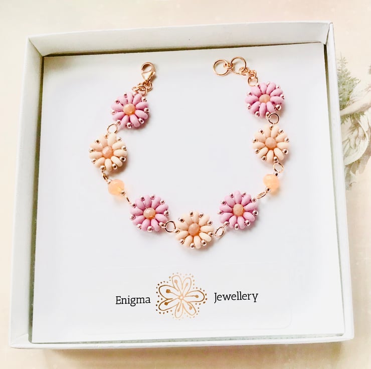 This is such a pretty bracelet - cute beaded daisies using stunning Czech glass beads - the colours are just beautiful! Finished with sterling silver, rose gold plated clasp, which allows size to be adjusted- just perfect!