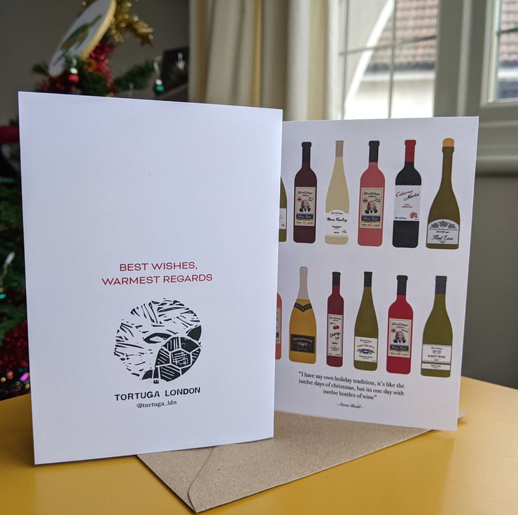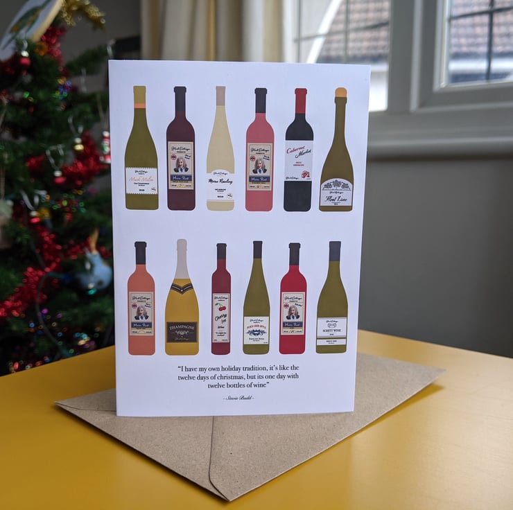 A fun printed Christmas card depicting 12 bottles of wine, inspired by the popular show, Schitt's Creek. Printed on 220gsm matte photo card, this A6 card comes with a recycled kraft envelope without cellophane.