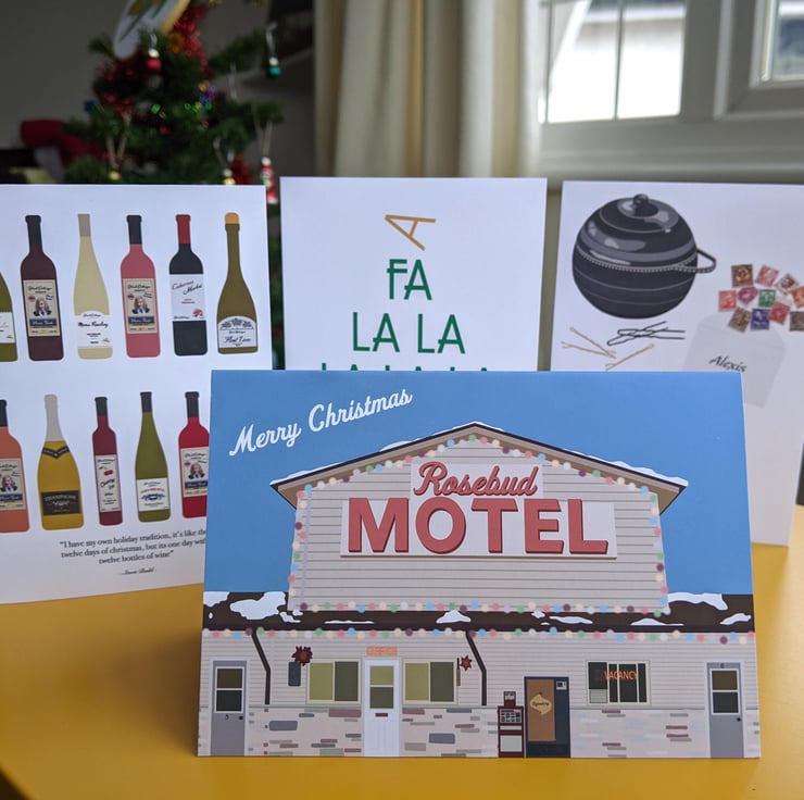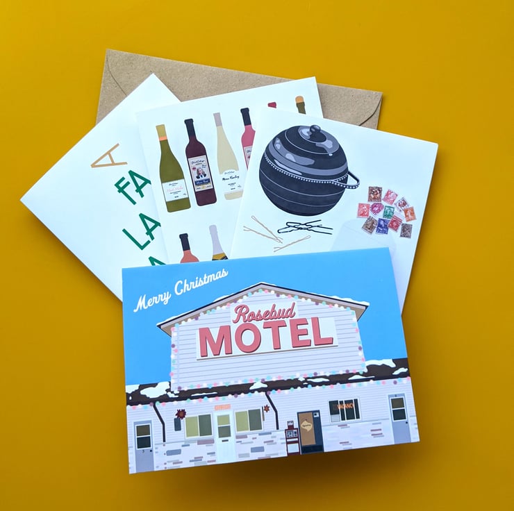 A pack of fun printed Christmas cards depicting the Rosebud Motel, 12 Wines of Christmas, A Little Bit Alexis and 3 Christmas Gifts, from the popular show, Schitt's Creek. Printed on 220gsm matte photo card, these A6 cards come with recycled kraft envelopes, without cellophane.