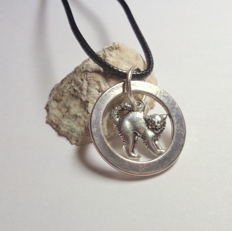 This pendant is a silver metal hoop (about the size of a 50p coin) and a double-sided and free-moving cat charm. The cat is from the high quality "Tierracast" range. It's rather angry looking cat, so be prepared for Cattitude!