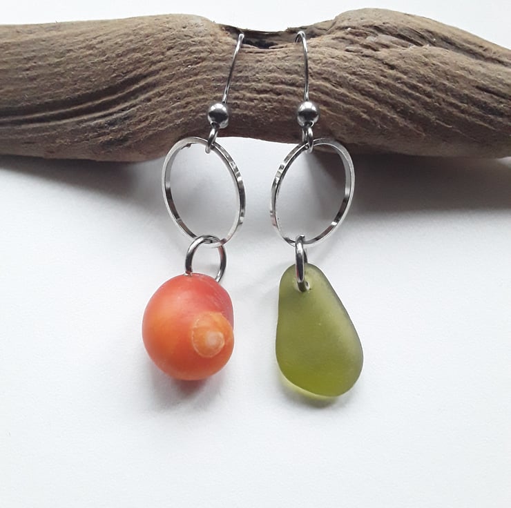 One earring has an unusually vibrant orange periwinkle shell, the other earring has a smooth, beautifully sea-worn, peridot/chartreuse green piece of seaglass. (I always wonder what it once was?!)