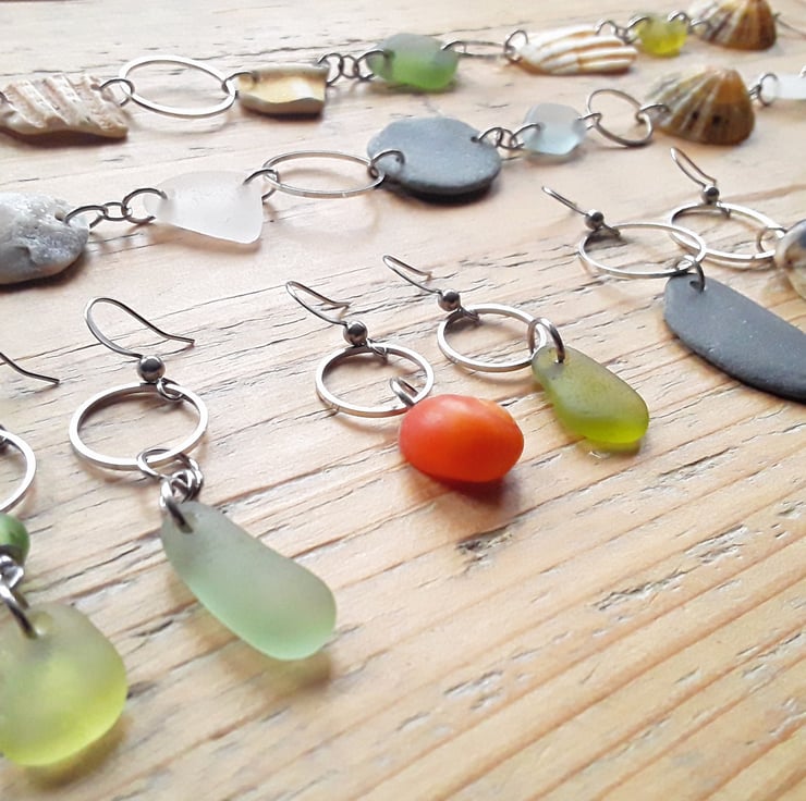 This lovely pair of asymmetrical seaglass and shell earrings has been made from things I found on the beach, then hand-drilled and hung from 2cm diameter, stainless steel circles, making them wonderfully light and swingy with a contemporary edge.
