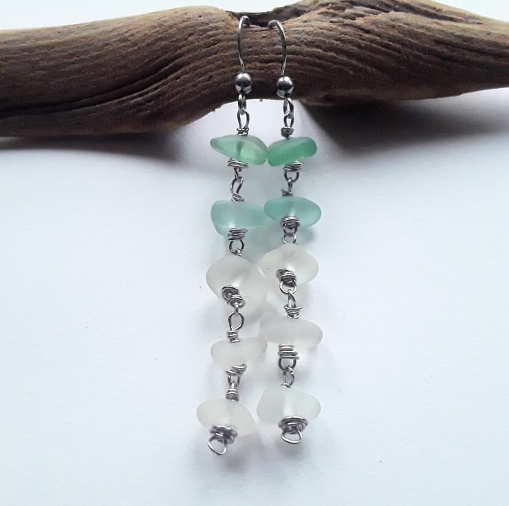 Each 6cm long earring is made up of 5 little seaglass nuggets, hand-drilled and beaded together using stainless steel wire.