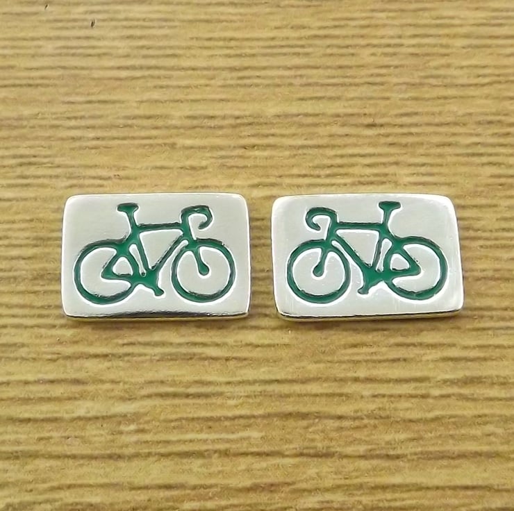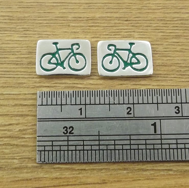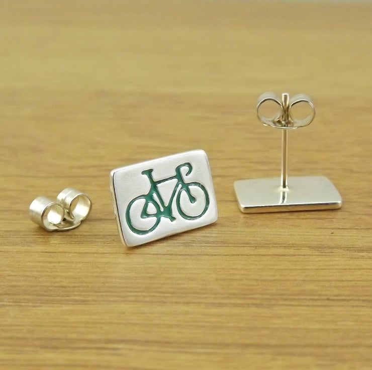 These stud earrings feature an image of a road bicycle and have been lovingly handmade in the UK. They are crafted from sterling silver sheet and are etched before being cut by hand, the edges are then smoothed using files and emery paper before the 11mm ear pins are then soldered onto the back. A coloured resin based enamel is added to the etched areas and then the earrings are polished.