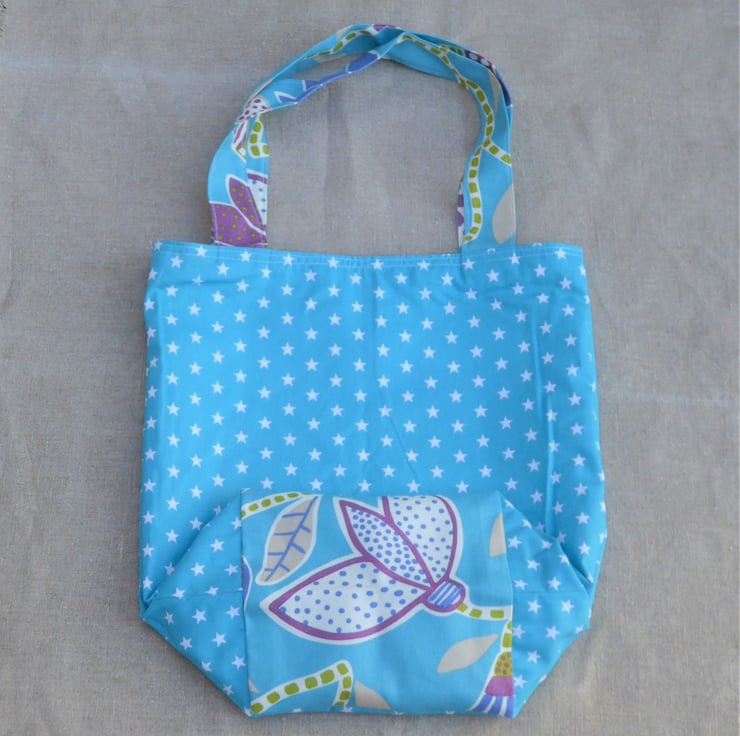 Fully reversible, 100% cotton. Approximately 32 cm/12.5" wide, 31 cm/12" deep, straps 44 cm/17.5" long. Base approximately 18 cm/7" x 13 cm/5". Washable, best air dried.