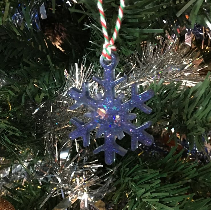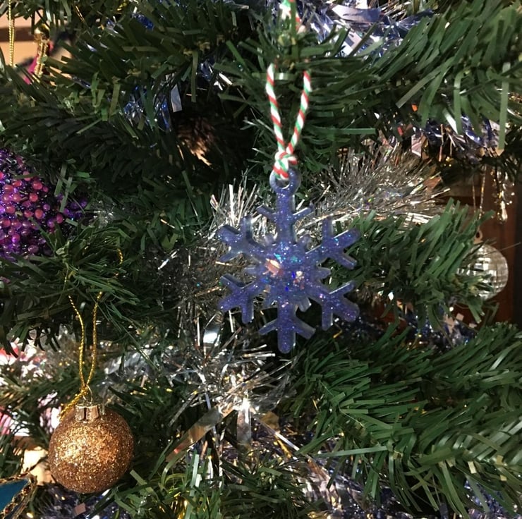 I mix Eco friendly and ethically sourced mica powders and glitter with resin to create this sparkly snowflake Christmas tree decoration.