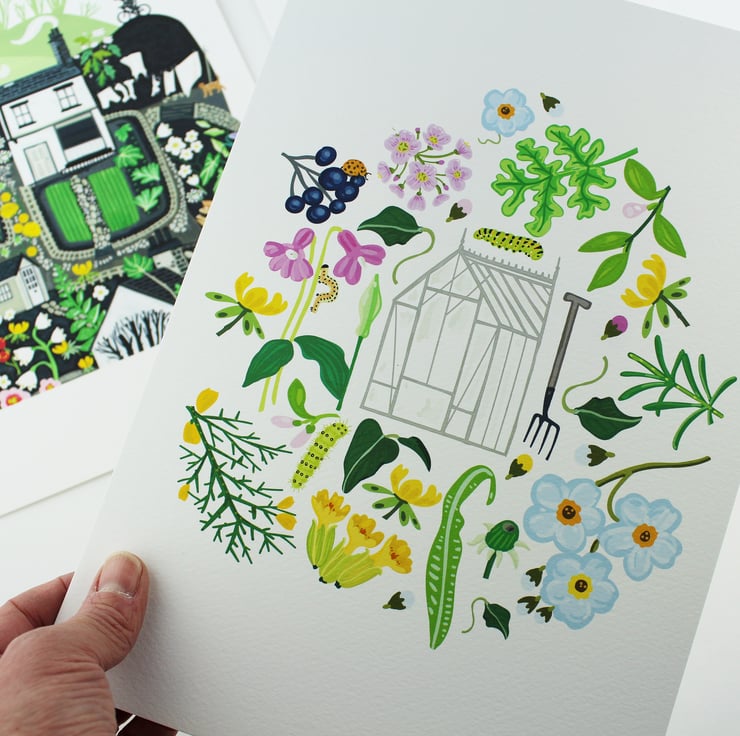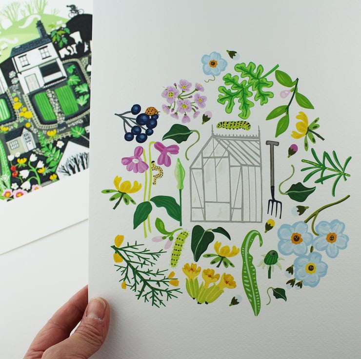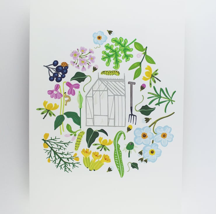 A4 illustration of wild flowers and a greenhouse, printed on Giclee quality water colour paper, using archival inks that are highly resistant to fading. The illustration is part of a collection I have illustrated from the lovely walks I take around our local rivers and moorland in and around North Yorkshire.