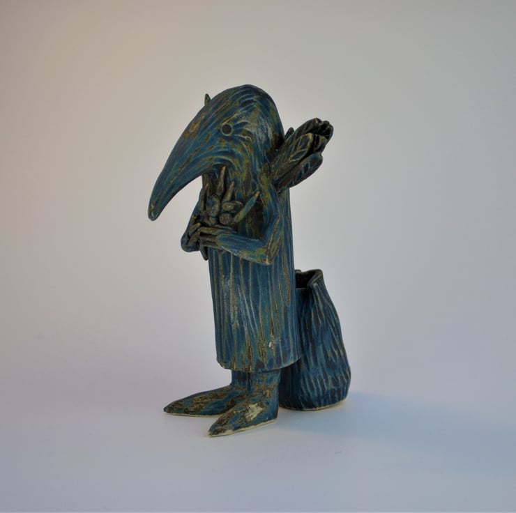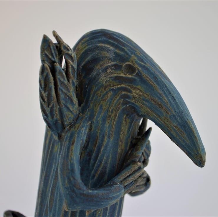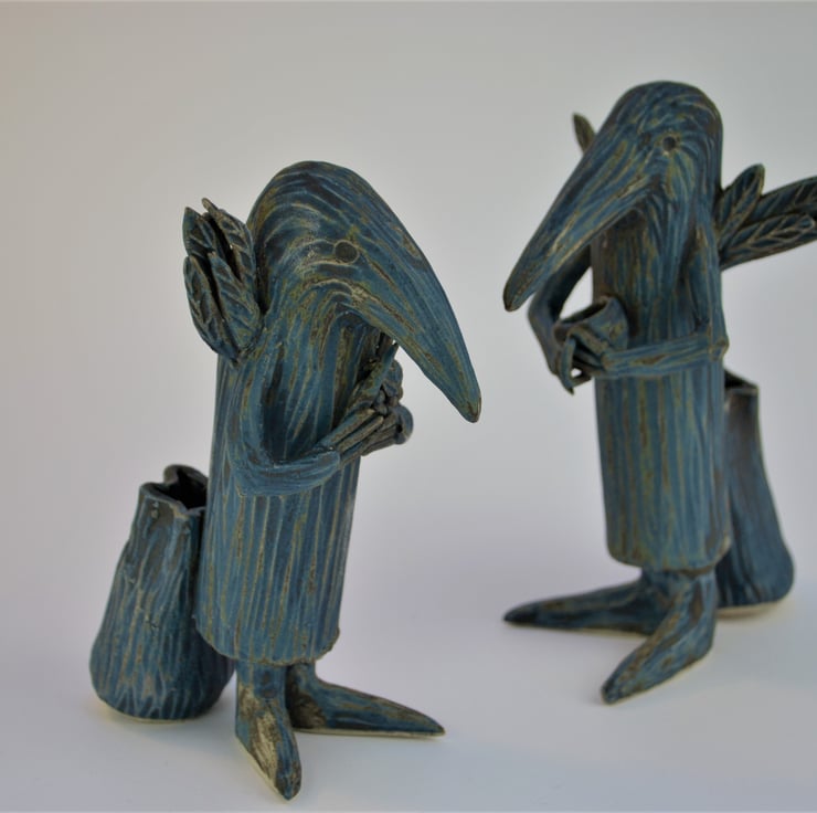Glazed in a fantastically unpredictable glaze, its blue, green, brown and all the shades in-between. The glaze accentuates the carving and individual modelling, while the carving influences the colours on the birds as the differences in glaze thickness alters the colour. Dry to touch, which adds to the look and feel of the creatures.