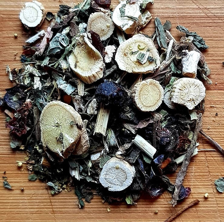 Astragalus root, Rosehip, Dandelion leaf & root, Meadowsweet, Nettle, Golden rod.