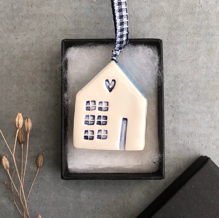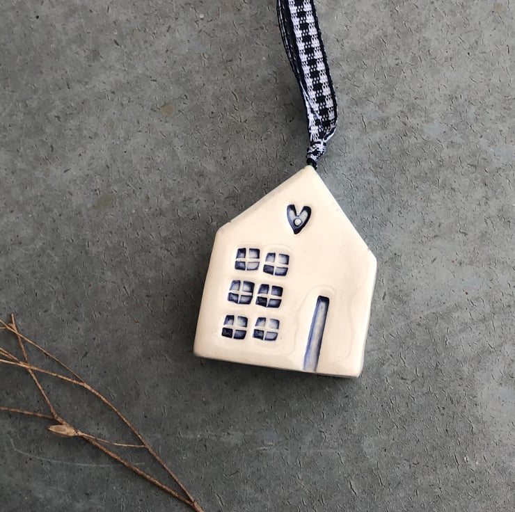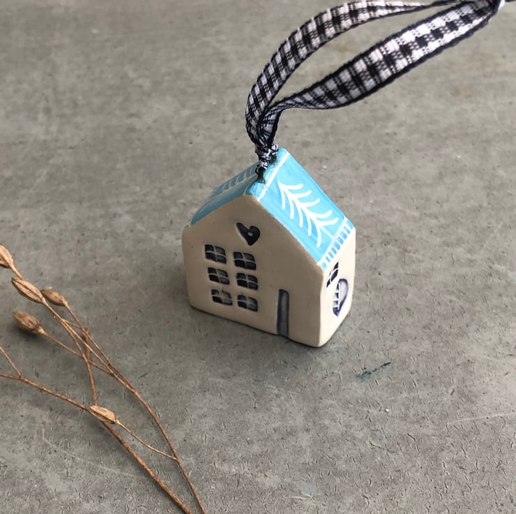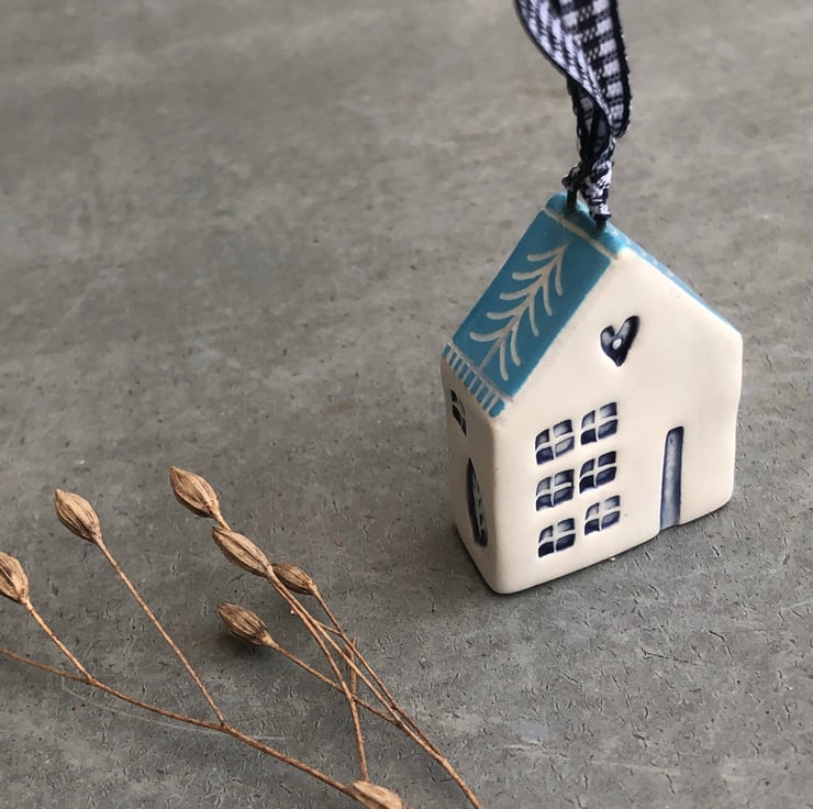 Each decoration is hand made from white earthenware clay, decorated with coloured slips and a hand drawn scraffito design. Decoration has also been added using my own handmade clay stamps and underglaze colours .Gingham ribbon is attached to allow the decoration to be hung.