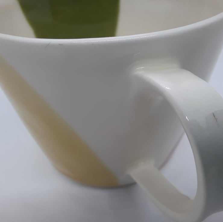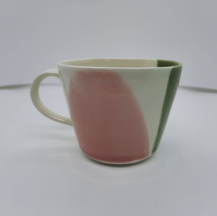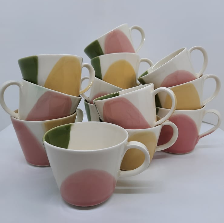 Small espresso cups hand thrown in porcelain stoneware with a pink, yellow and green decoration in a glossy gaze.