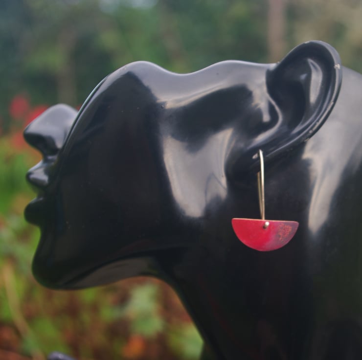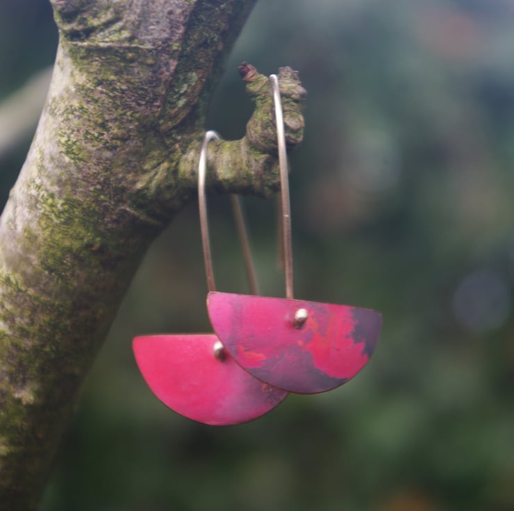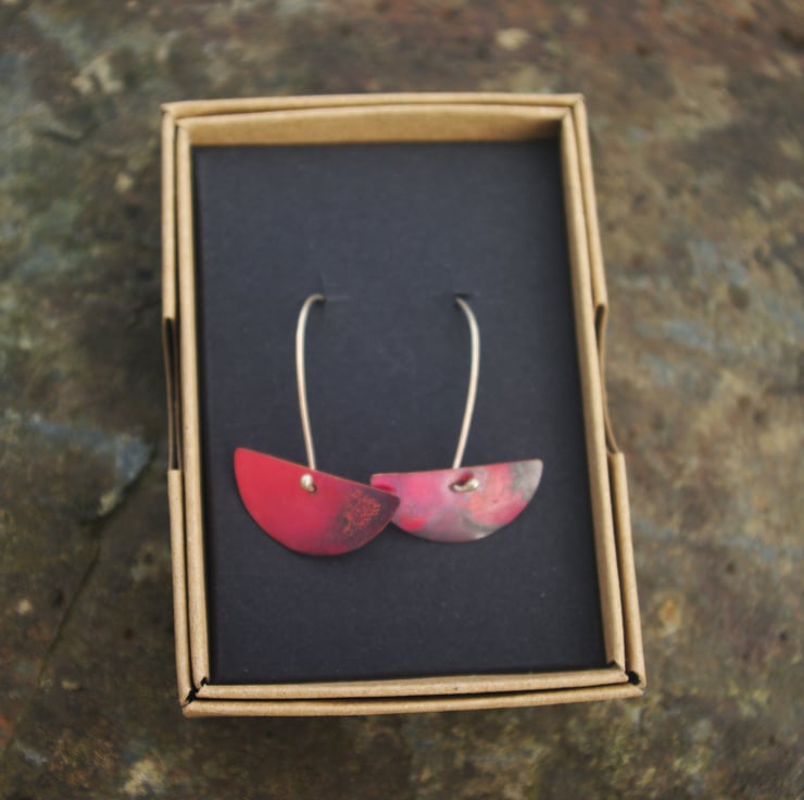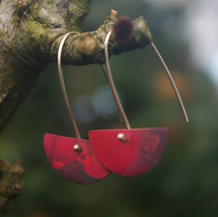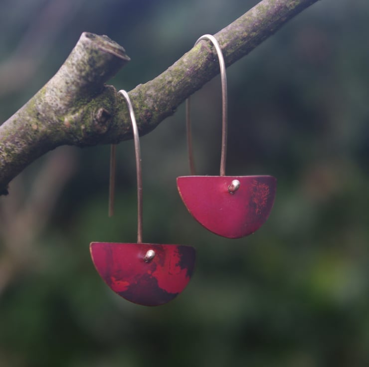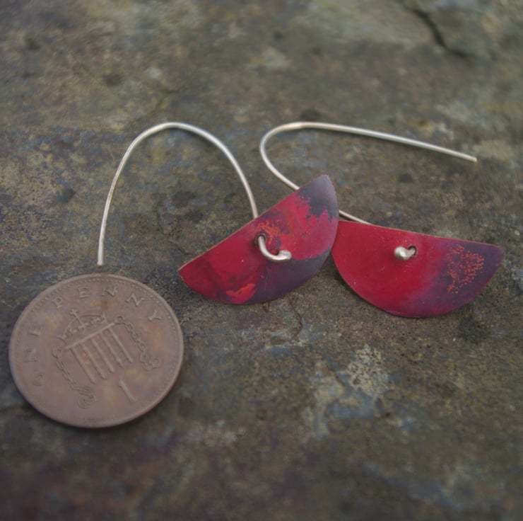 I have cut out pieces of copper into semi circle shapes, with a diameter of 22mm/ just under an inch .The copper has been treated with heat to produce unique, luscious shades of red, and a bit of purple and black .These colours are preserved in the copper and finished with a penetrating wax. They hang from handmade ear hooks, made with recycled sterling silver wire. The total dangle is 35mm / just over 1.25 inches.