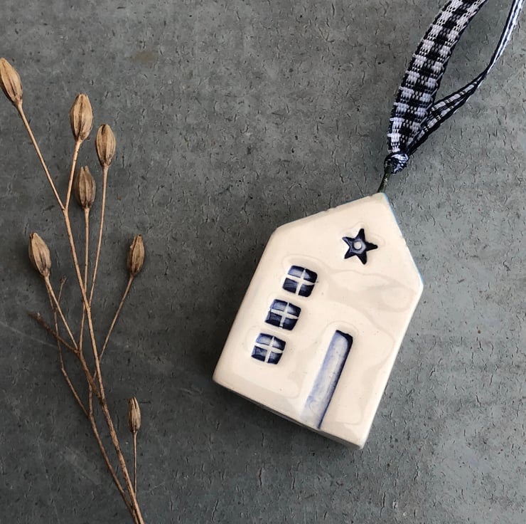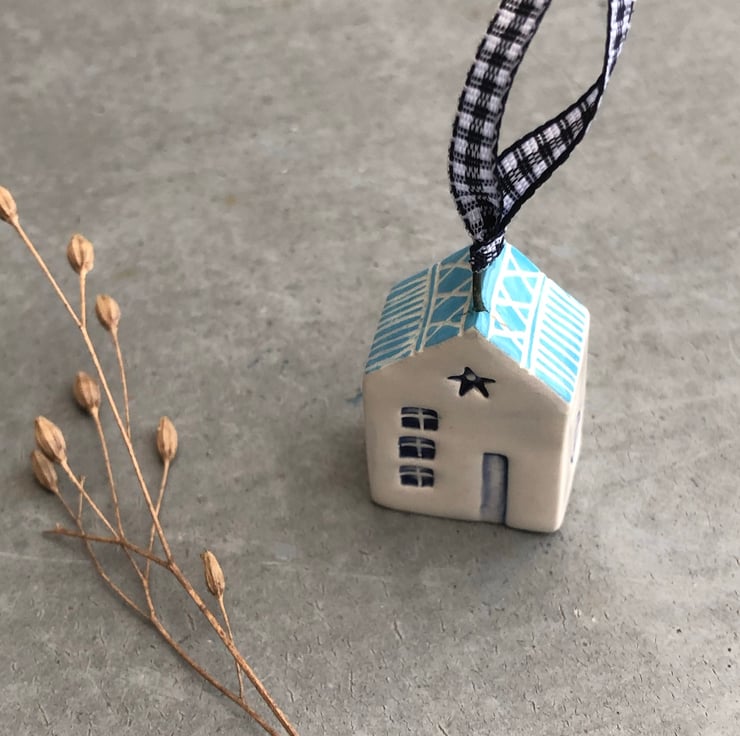 Each decoration is hand made from white earthenware clay, decorated with coloured slips and a hand drawn scraffito design. Decoration has also been added using my own handmade clay stamps and underglaze colours .Gingham ribbon is attached to allow the decoration to be hung.