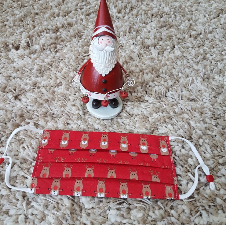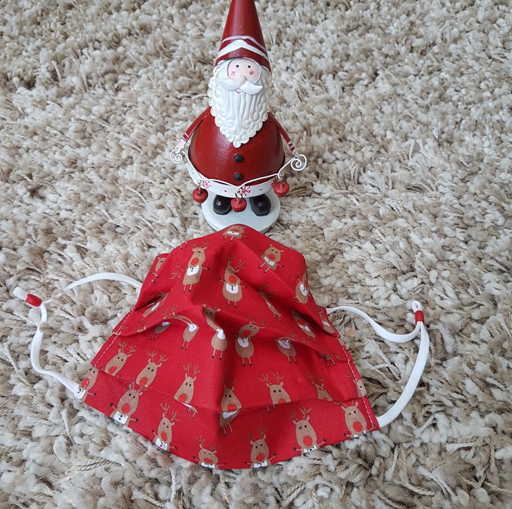 Small Adult/Teenager festive face covering made from a reindeers in bow ties print on red cotton. The face mask is made with 2 layers of cotton forming an inner pocket for a filter (not included) and is fastened over the ears with 2 loops of elastic and a toggle adjuster.