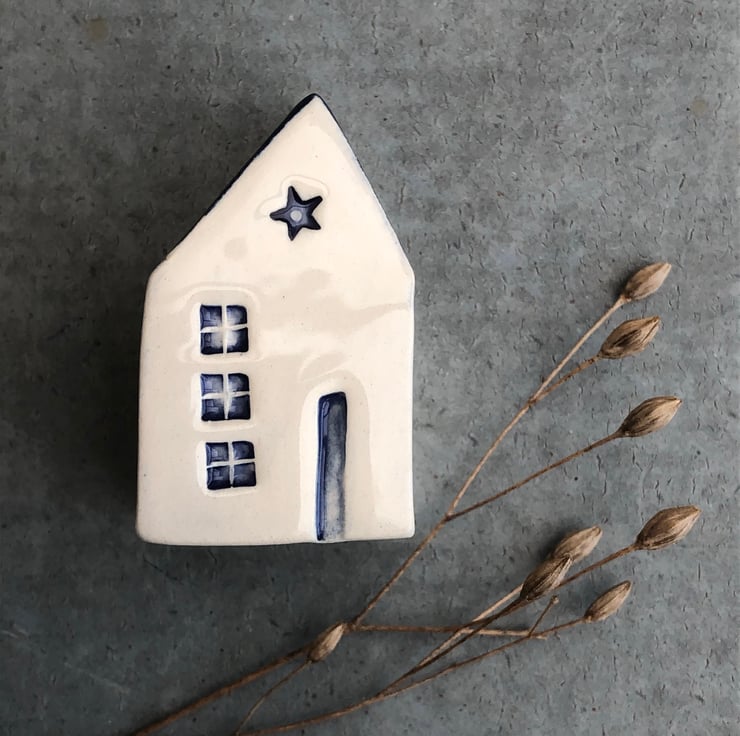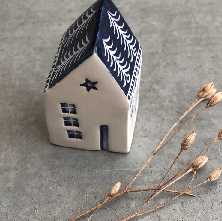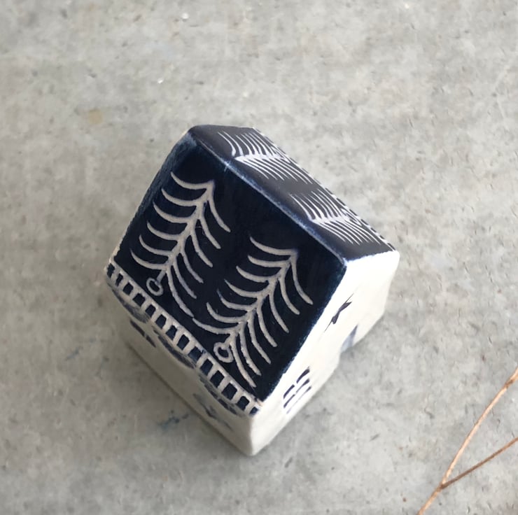 This house is hand built from white earthenware clay, decorated with coloured slip and finished with a hand drawn design using the scraffito technique. Impressed designs have also been added using my own handmade stamps decorated with underglaze .