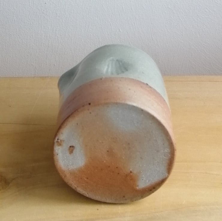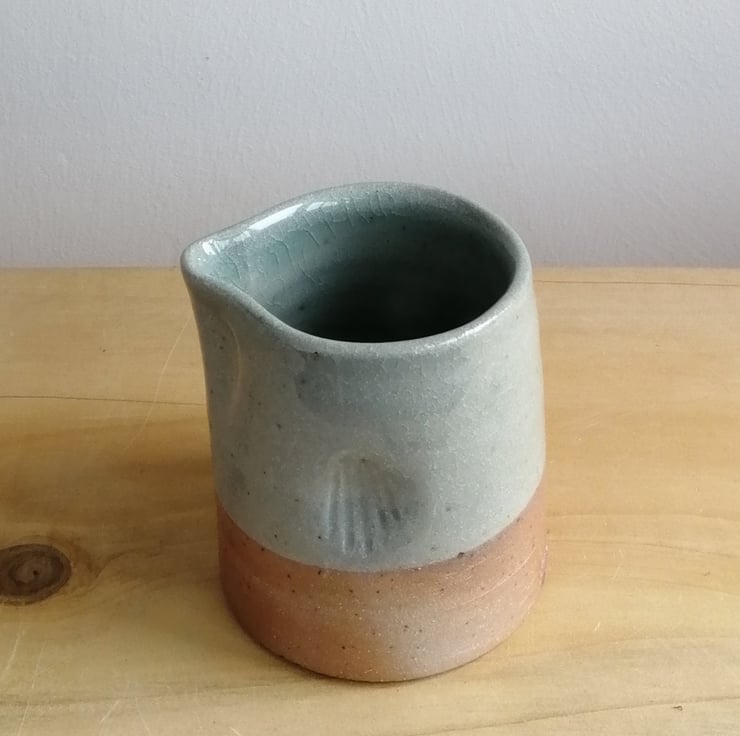 The jug is first thrown, the pouring lip is made and I added shell imprints each side for decoration and also to grip. It was then left until it is leather hard, then turned and I add my makers mark. Once dry it is bisque fired, glaze applied and it is fired again in a wood kiln to over 1260 oC. Where the flames catch the pot there is a rose coloured shine to the pottery. All glazes are lead free. The marks on the base are where wadding is attached to stop the pots sticking to the kiln shelf.