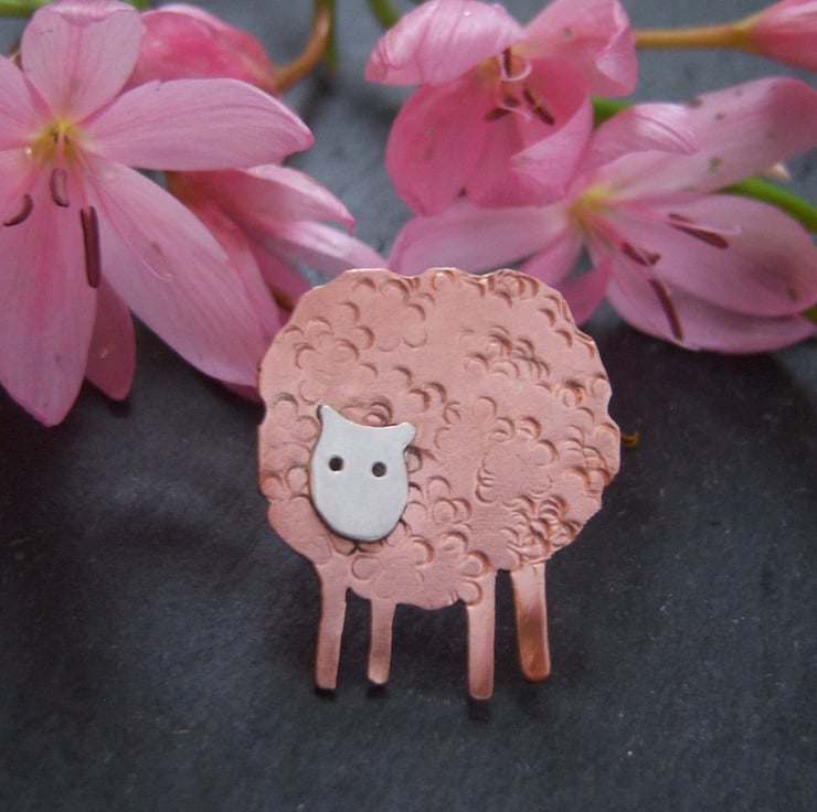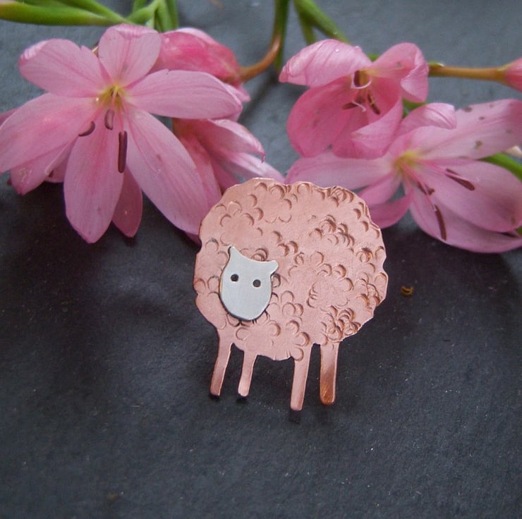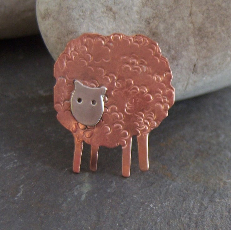 A sheep cut from copper sheet and textured. The face and the brooch fastener are sterling silver. Approximately 3cms tall.