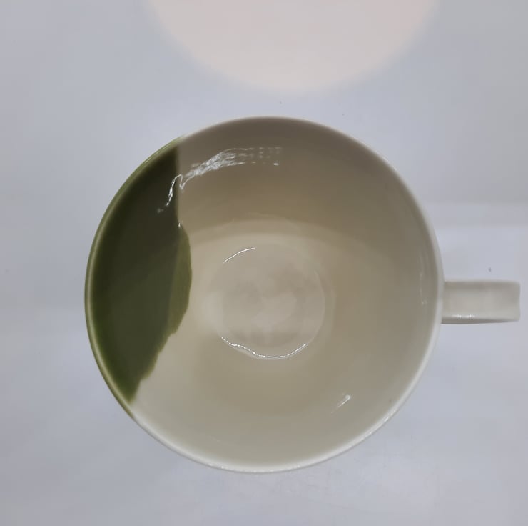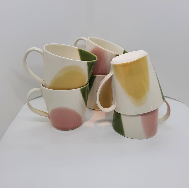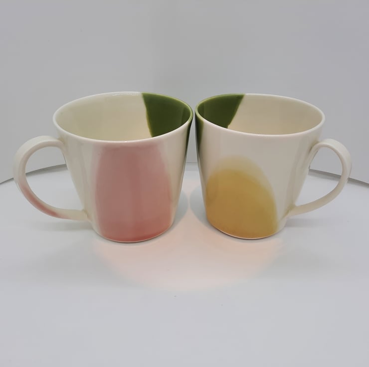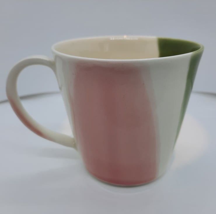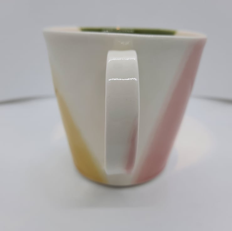 Hand made large mug with a glossy pink, green and yellow glaze pattern. As the mugs are hand thrown and hand glazed they are all slightly different but matching if you want more than one.
